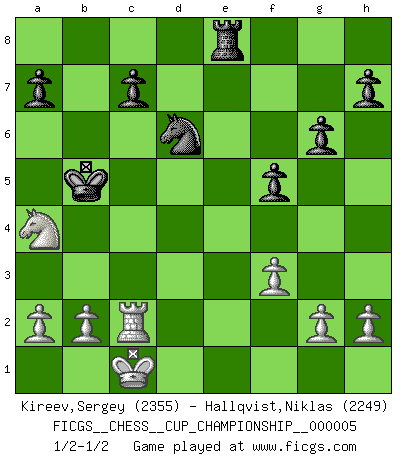Last move : 1/2-1/2 2023 May 18 20:7:7 [Event "FICGS__CHESS__CUP_CHAMPIONSHIP__000005"] [Site "FICGS"] [Date "2023.03.23"] [Round "1"] [White "Kireev,Sergey"] [Black "Hallqvist,Niklas"] [Result "1/2-1/2"] [WhiteElo "2355"] [BlackElo "2249"] 1.d4 e6 2.c4 b6 3.e4 Bb4+ 4.Nc3 Bb7 5.f3 f5 6.exf5 Nh6 7.fxe6 Nf5 8.Bf4 dxe6 9.Qd3 Nxd4 10.O-O-O Nbc6 11.Nge2 Nf5 12.Ng3 Qxd3 13.Rxd3 Bd6 14.Bxd6 Nxd6 15.Re3 Nd4 16.Bd3 O-O-O 17.Rd1 g6 18.c5 N6f5 19.Nxf5 exf5 20.Bc4 bxc5 21.Na4 Bd5 22.Ba6+ Bb7 23.Bxb7+ Kxb7 24.Nxc5+ Kc6 25.Na4 Nb5 26.Re6+ Rd6 27.R1xd6+ Nxd6 28.Re2 Re8 29.Rc2+ Kb5 30.Nc3+ Kc6 31.Na4 Kb5 1/2-1/2 Follow this game move after move (download)Chess is above all, a fight ! (Emanuel Lasker) Nie in meinem Leben habe ich die französische Verteidigung gespielt, welche die Stumpfsinnigste von allen ist. (Wilhelm Steinitz) Observen a Garry Kasparov. Después de una derrota, invariablemente el gana la próxima partida. Prácticamente hace pedazos a su siguiente oponente. Eso es algo que tenemos que aprender a lograr. (Maurice Ashley) Ne tendez aucun piège pour le plaisir ! Ne jouez rien dans l'espoir que l'adversaire réagisse de façon stupide ! Prenez toujours pour acquis que l'adversaire va trouver le meilleur coup ! Ne jouez jamais de coup dans l'espoir que l'adversaire ne voie pas la menace ! Chacun de vos coups doit améliorer la position d'une façon ou d'une autre. However beautiful the strategy, you should occasionally look at the results. (Winston Churchill)