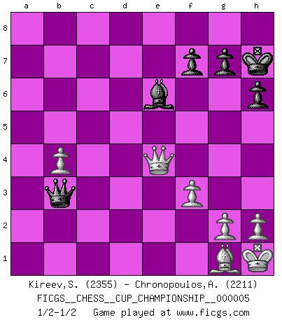Last move : 1/2-1/2 2023 April 4 22:25:21 [Event "FICGS__CHESS__CUP_CHAMPIONSHIP__000005"] [Site "FICGS"] [Date "2023.03.23"] [Round "1"] [White "Kireev,Sergey"] [Black "Chronopoulos,Antonis"] [Result "1/2-1/2"] [WhiteElo "2355"] [BlackElo "2211"] 1.e4 c5 2.Nf3 d6 3.d4 Nf6 4.dxc5 Nxe4 5.cxd6 Nc6 6.Be3 e5 7.Bd3 Nf6 8.Nc3 Bxd6 9.O-O h6 10.Nd2 Bg4 11.f3 Be6 12.Nde4 Nxe4 13.Nxe4 Be7 14.c3 O-O 15.Nc5 Qb6 16.b4 Rfd8 17.Qe2 Bxc5 18.Bxc5 Qc7 19.Rfd1 Rd7 20.Bb5 Rad8 21.Rxd7 Rxd7 22.a4 a6 23.Bxc6 Qxc6 24.Qxe5 Rd8 25.Qe2 a5 26.Qf2 Rd5 27.Qg3 Qd7 28.Kh1 Rd1+ 29.Rxd1 Qxd1+ 30.Bg1 axb4 31.cxb4 Qxa4 32.Qb8+ Kh7 33.Qxb7 Qb3 34.Qe4+ 1/2-1/2 Follow this game move after move (download)I'm not a materialistic person, in that, I don't suffer the lack or loss of money. The absence of worldly goods I don't look back on. For Chess is a way I can be as materialistic as I want without having to sell my soul. (Jamie Walter Adams) Alle offensichtlichen Züge sehen nach dem Spiel in der Analyse verdächtig aus. (Viktor Kortschnoi) Estaba muy claro de que el punto vulnerable del Gran Maestro Americano (Bobby Fischer) radicaba en las posiciones de doble filo, colgantes, irracionales, donde el siempre falló en encontrar un triunfo aún en una posición de clara victoria. (Efim Geller) Ce qui est bien, c'est d'avoir tout un tas de pièces en prise : l'adversaire ne peut en prendre qu'une à la fois. Cité par Thierry Audin. I have opinions of my own - strong opinions - but I don't always agree with them. (George Bush)