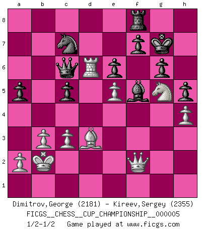 Last move : 1/2-1/2 2023 April 24 20:8:15 [Event "FICGS__CHESS__CUP_CHAMPIONSHIP__000005"] [Site "FICGS"] [Date "2023.03.23"] [Round "1"] [White "Dimitrov,George"] [Black "Kireev,Sergey"] [Result "1/2-1/2"] [WhiteElo "2181"] [BlackElo "2355"] 1.e4 g6 2.d4 Bg7 3.Nc3 d6 4.Be3 Nf6 5.Qd2 c6 6.Nf3 O-O 7.Bh6 d5 8.e5 Ne4 9.Nxe4 dxe4 10.Bxg7 Kxg7 11.Ng5 Bf5 12.f3 exf3 13.Nxf3 Qb6 14.O-O-O Na6 15.Bc4 Nc7 16.h4 h5 17.Rhf1 e6 18.Ng5 Rad8 19.c3 c5 20.g4 Bxg4 21.Qf2 Bf5 22.dxc5 Rxd1+ 23.Rxd1 Qc6 24.b3 b6 25.Rd6 Qh1+ 26.Rd1 Qc6 27.Kb2 bxc5 28.Rd6 Qh1 29.Bd3 a5 30.Rd7 Qc6 31.Rd6 1/2-1/2 Follow this game move after move (download)A bad plan is better than none at all. (Frank Marshall) Wie bekannt hörte Morphy 1859 auf, Schach zu spielen. Seine Enttäuschung galt nicht so sehr dem Schach, wie den Schachspielern. (Robert James Fischer) El arma más poderosa en el Ajedrez, es tener la próxima movida. (David Bronstein) C'est la seule position que je connaisse où les deux camps sont mals. Propos prêtés à V. Anand. Think like a man of action, act like a man of thought. (Henri Louis Bergson)