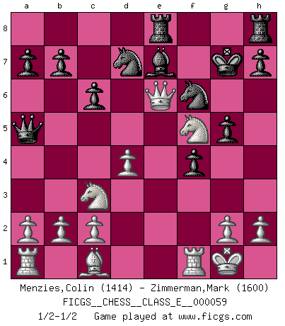 Last move : 1/2-1/2 2007 November 2 4:50:21 [Event "FICGS__CHESS__CLASS_E__000059"] [Site "FICGS"] [Date "2007.08.25"] [Round "1"] [White "Menzies,Colin"] [Black "Zimmerman,Mark"] [Result "1/2-1/2"] [WhiteElo "1414"] [BlackElo "1600"] 1.e4 e5 2.f4 d5 3.exd5 exf4 4.Nf3 Qxd5 5.Nc3 Qa5 6.Bb5+ c6 7.Qe2+ Be7 8.Bc4 Bg4 9.Bxf7+ Kxf7 10.Ne5+ Kf8 11.Nxg4 Nd7 12.O-O Ngf6 13.d4 g5 14.Qe6 Re8 15.Nh6 Kg7 16.Nf5+ Kf8 17.Nh6 Kg7 18.Nf5+ 1/2-1/2 KGD : Falkbeer counter-gambit Kingside Castling by player White (move 12) This chess game ended in a draw. Follow this game move after move (download)Why must I lose to this idiot ? (Aron Nimzovich) Man wirke der falschen Auffassung entgegen, als ob jeder Zug Unmittelbares zu leisten habe; auch Werte- und Ruhezüge haben ihre Existenzberechtigung. (Aaron Nimzowitsch) No puedes jugar al Ajedrez si eres de corazón noble. (Proverbio Francés) Il (Jacob Murray) ne joue pas pour le bon coup, mais pour le meilleur. (Eloi Relange) A person who never made a mistake never tried anything new. (Albert Einstein)