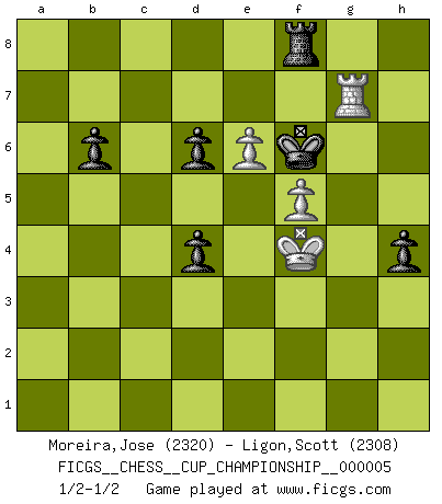 Last move : 1/2-1/2 2023 March 30 23:11:7 [Event "FICGS__CHESS__CUP_CHAMPIONSHIP__000005"] [Site "FICGS"] [Date "2023.03.23"] [Round "1"] [White "Moreira,Jose"] [Black "Ligon,Scott"] [Result "1/2-1/2"] [WhiteElo "2320"] [BlackElo "2308"] 1.e4 Nf6 2.e5 Nd5 3.c4 Nb6 4.d4 d6 5.exd6 exd6 6.h3 Be7 7.Nf3 Bf6 8.Be2 O-O 9.O-O c5 10.d5 Bf5 11.Bd3 Bxd3 12.Qxd3 N8d7 13.Nc3 Ne5 14.Nxe5 Bxe5 15.Bd2 f5 16.f4 Bd4+ 17.Kh2 Qd7 18.b3 Rae8 19.Rae1 Bf6 20.a4 Na8 21.Rxe8 Rxe8 22.g4 fxg4 23.Ne4 gxh3 24.Nxf6+ gxf6 25.Bc3 Qf7 26.Rg1+ Kh8 27.Qf5 Rf8 28.Qe6 Qxe6 29.dxe6 Nc7 30.f5 Ne8 31.b4 Rg8 32.Rd1 Rg2+ 33.Kxh3 Rc2 34.Rd3 b6 35.Kg3 Kg8 36.b5 h5 37.Kf3 h4 38.Ke4 Nc7 39.a5 Kf8 40.Bxf6 Rxc4+ 41.Kf3 Nxb5 42.axb6 axb6 43.Rd1 Nd4+ 44.Bxd4 cxd4 45.Kf4 Ke7 46.Re1 Rc8 47.Rg1 Rf8 48.Rg7+ Kf6 49.Rg6+ Ke7 50.Rg7+ Kf6 1/2-1/2 Follow this game move after move (download)I know people who have all the will in the world, but still can't play good Chess. (Bobby Fischer) Er war ein guter Schachspieler, aber ich kann Leute nicht ausstehen, die 'Heil Hitler' rufen (Über Alexander Aljechin). (Miguel Najdorf) No soy una persona materialista y por eso, no resiento la falta o pérdida del dinero. La ausencia de cosas mundanas carece de importancia. Ya que el Ajedrez es una forma en la que puedo ser tan materialista como yo desee sin tener la necesidad de vender mi alma. (Jamie Walter Adams) Votre prénom est 'Tactique', votre deuxième prénom est 'Tactique' et votre nom est 'Tactique'. (Ken Smith) Perseverance does not equal worthiness. Next time you want to get my attention, wear something fun. Low-riding jeans are hot. (Gregory House, House M.D.)
