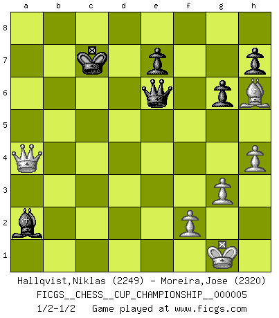 Last move : 1/2-1/2 2023 May 19 22:38:31 [Event "FICGS__CHESS__CUP_CHAMPIONSHIP__000005"] [Site "FICGS"] [Date "2023.03.23"] [Round "1"] [White "Hallqvist,Niklas"] [Black "Moreira,Jose"] [Result "1/2-1/2"] [WhiteElo "2249"] [BlackElo "2320"] 1.Nf3 Nf6 2.c4 c5 3.g3 d5 4.cxd5 Nxd5 5.Bg2 Nc6 6.Nc3 g6 7.O-O Bg7 8.d4 cxd4 9.Nxd4 Nxc3 10.bxc3 Nxd4 11.cxd4 Qxd4 12.Rb1 O-O 13.Bg5 Qe5 14.h4 Bf6 15.Bh6 Bf5 16.Rxb7 Rfd8 17.Rxa7 Rac8 18.Qe1 Qe6 19.Bb7 Rb8 20.Qa5 Qxe2 21.Ra8 Rxa8 22.Bxa8 Rb8 23.Bd5 Bd4 24.Bxf7+ Kxf7 25.Qd5+ Qe6 26.Qxd4 Rb1 27.Qg7+ Ke8 28.Rxb1 Bxb1 29.Qf8+ Kd7 30.Qf4 Bxa2 31.Qa4+ Kc7 1/2-1/2 Follow this game move after move (download)First-class players lose to second class players because second-class players sometimes play a first-class game. (Tarrasch) Ich verstehe den Grund nicht, warum die Aufteilung in Frauen und Männer überhaupt im Schach besteht. (Judith Polgar) A través de las casillas del tablero, los Indios explican el movimiento del tiempo y la edad, las influencias mas altas que controlan el mundo y los lazos que vinculan al Ajedrez con el alma humana. (Al-Masudi) Il a essayé de se convaincre qu'il pourrait empêcher toutes les erreurs et ne jamais perdre. L'horreur ! Gary Kasparov au sujet de Robert Fischer. Art is not a thing, it is a way. (Elbert Hubbard)