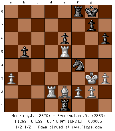 Last move : 1/2-1/2 2023 July 5 20:48:47 [Event "FICGS__CHESS__CUP_CHAMPIONSHIP__000005"] [Site "FICGS"] [Date "2023.03.23"] [Round "1"] [White "Moreira,Jose"] [Black "Broekhuizen,A. T. S."] [Result "1/2-1/2"] [WhiteElo "2320"] [BlackElo "2233"] 1.e4 e5 2.Nf3 Nc6 3.Bc4 Bc5 4.c3 Nf6 5.d3 a5 6.O-O d6 7.Nbd2 O-O 8.h3 Be6 9.Bb5 h6 10.Re1 Qb8 11.Nf1 Qa7 12.Be3 Bxe3 13.Nxe3 a4 14.d4 Qa5 15.Bd3 Ne7 16.c4 exd4 17.Nxd4 Nc6 18.Nb5 Ne5 19.Rc1 Rad8 20.Bf1 Nxc4 21.Nxc7 Nxb2 22.Qd4 a3 23.Nxe6 fxe6 24.Nc4 Nxc4 25.Bxc4 Rfe8 26.e5 dxe5 27.Qxe5 Qxe5 28.Rxe5 Nd5 29.Rb1 Re7 30.Rb3 Rc7 31.Be2 Rc1+ 32.Kh2 Re1 33.Rxa3 Rf8 34.Kg3 Nf4 35.Rae3 Nd5 36.Rd3 Nf4 37.Rd2 b5 38.a3 1/2-1/2 Follow this game move after move (download)With or without the title, Bobby Fischer was unquestionably the greatest player of his time. (Burt Hochberg) Ich verachte die Medien. (Robert James Fischer) En posiciones complicadas, Bobby Fischer pocas veces tuvo que temer de cualquiera. (Paul Keres) Pour se monter efficace, un Cavalier a besoin d'avant-postes ! Les Cavaliers font les meilleurs bloqueurs de pions passés. It's not enough to succeed. Others must fail. (Gore Vidal)