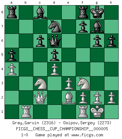 Last move : 1-0 2023 April 10 12:9:56 [Event "FICGS__CHESS__CUP_CHAMPIONSHIP__000005"] [Site "FICGS"] [Date "2023.03.23"] [Round "1"] [White "Gray,Garvin"] [Black "Osipov,Sergey"] [Result "1-0"] [WhiteElo "2316"] [BlackElo "2273"] 1.d4 Nf6 2.c4 e6 3.Nf3 d5 4.Nc3 c6 5.Bg5 h6 6.Bxf6 Qxf6 7.e3 Nd7 8.Be2 g6 9.O-O Bg7 10.cxd5 exd5 11.b4 a6 12.a4 O-O 13.b5 Qd6 14.bxc6 bxc6 15.Rb1 a5 16.Qc2 1-0 Follow this game move after move (download)Half the variations which are calculated in a tournament game turn out to be completely superfluous. Unfortunately, no one knows in advance which half. (Jan Tinman) Eine Person mit durchschnittlichem IQ kann etwa eine ELO von 2000 erreichen. (Jonathan Levitt) En el Ajedrez, tal como es jugado por los Maestros, practicamente la suerte es eliminada. (Emanuel Lasker) Les échecs sont un jeu par leur forme, un art par leur essence et une science par sa difficulté d'acquisition. Ils peuvent vous procurer autant de plaisir qu'un bon livre ou une belle musique, mais vous n'aurez une réelle joie que si vous arrivez à bien jouer. (Tigran Petrosian) Yoga is 99% practice and 1% knowledge. (Sri Krishna Pattabhi Jois)