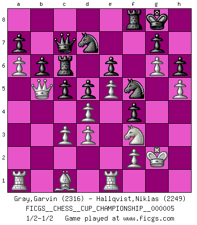 Last move : 1/2-1/2 2023 June 3 4:7:15 [Event "FICGS__CHESS__CUP_CHAMPIONSHIP__000005"] [Site "FICGS"] [Date "2023.03.23"] [Round "1"] [White "Gray,Garvin"] [Black "Hallqvist,Niklas"] [Result "1/2-1/2"] [WhiteElo "2316"] [BlackElo "2249"] 1.d4 e6 2.e4 d5 3.Nc3 Bb4 4.e5 c5 5.a3 Bxc3+ 6.bxc3 Ne7 7.Nf3 b6 8.Bb5+ Bd7 9.Bd3 Bc8 10.h4 Ba6 11.a4 Bxd3 12.cxd3 h6 13.Ba3 Nd7 14.a5 Rc8 15.a6 Rc6 16.O-O O-O 17.Qa4 Qc7 18.h5 Rc8 19.g3 Nf5 20.g4 Ne7 21.Rfe1 Rf8 22.Bc1 Rb8 23.Qb5 Rf8 24.Kg2 f5 25.g5 f4 26.g6 Nf5 1/2-1/2 Follow this game move after move (download)Not all artists are Chess players, but all Chess players are artists. (Marcel Duchamp) Das Spiel gibt uns die Genugtuung, die das Leben uns versagt. (Emanuel Lasker) Por la belleza de sus partidas, la claridad de su juego y lo brillante de sus ideas, Fischer se creó el mismo como un artista de la misma estatura como Brahms, Rembrandt y Shakespeare. (David Levy) Aucun coup ne doit être joué sans but. (Pedro Damiano) It's not the will to win, but the will to prepare to win that makes the difference. (Bear Bryant)
