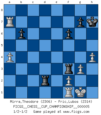 Last move : 1/2-1/2 2023 May 20 13:49:31 [Event "FICGS__CHESS__CUP_CHAMPIONSHIP__000005"] [Site "FICGS"] [Date "2023.03.23"] [Round "1"] [White "Mirra,Theodore"] [Black "Fric,Lubos"] [Result "1/2-1/2"] [WhiteElo "2306"] [BlackElo "2314"] 1.d4 Nf6 2.c4 e6 3.Nf3 d5 4.g3 Bb4+ 5.Bd2 Be7 6.Bg2 Nbd7 7.O-O c6 8.Qc2 O-O 9.Bf4 b6 10.Nbd2 Ba6 11.Rfd1 Nh5 12.e3 Rc8 13.h4 Bb7 14.Ne5 c5 15.cxd5 exd5 16.dxc5 Nxf4 17.exf4 Nxe5 18.fxe5 Qc7 19.c6 Qxe5 20.Nc4 Rxc6 21.Qxh7+ Kxh7 22.Nxe5 Rc2 23.Bxd5 Bxd5 24.Rxd5 Rxb2 25.a4 f6 26.Nd3 Rd2 27.Rd7 Rd8 28.Rxe7 R8xd3 29.Rxa7 Rf3 30.Rf1 1/2-1/2 Follow this game move after move (download)A chess genius has died; a loss for humanity. (Viktor Kortchnoi, about Bobby Fischer's death) Ich bin der einzige Schachspieler, der sich während der Vorbereitungen zum Turnier verletzt hat. (Woody Allen) El Ajedrez es el juego mas altamente simbólico, pero las agresiones estan por lo tanto aún mas francamente representadas en la partida. Tal vez comenzo como un juego de guerra; Algo como la representación de una batalla en miniatura entre las fuerzas de dos reinos. (Karl Meninger) La guerre est enfant de la passion, la passion est enfant du narcissisme et le narcissisme est l'enfant. (...) Une autre partie ? (Thibault de Vassal) Man with more than one clock never knows what time it is. (Chinese thought)
