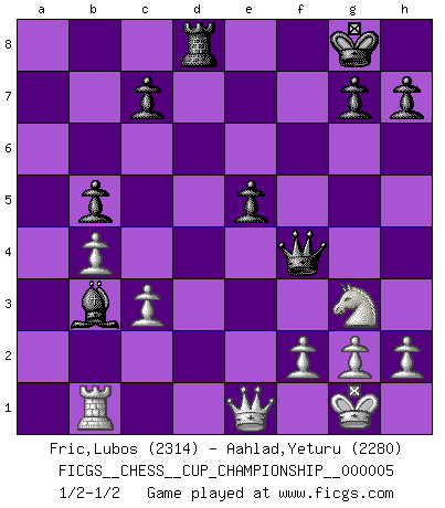 Last move : 1/2-1/2 2023 June 22 23:12:45 [Event "FICGS__CHESS__CUP_CHAMPIONSHIP__000005"] [Site "FICGS"] [Date "2023.03.23"] [Round "1"] [White "Fric,Lubos"] [Black "Aahlad,Yeturu"] [Result "1/2-1/2"] [WhiteElo "2314"] [BlackElo "2280"] 1.e4 e5 2.Nf3 Nc6 3.Bb5 a6 4.Ba4 Nf6 5.O-O Nxe4 6.d4 b5 7.Bb3 d5 8.dxe5 Be6 9.Be3 Bc5 10.Qe2 O-O 11.Rd1 Re8 12.c3 f6 13.Bc2 Qe7 14.a4 Rab8 15.axb5 axb5 16.Bxc5 Qxc5 17.b4 Qf8 18.Ra6 Nxe5 19.Nxe5 fxe5 20.Bxe4 dxe4 21.Nd2 Qf4 22.Nxe4 Rbd8 23.R6a1 Bc4 24.Qe1 Bd5 25.Ng3 Bb3 26.Rxd8 Rxd8 27.Rb1 Bc2 28.Rc1 Bb3 29.Rb1 1/2-1/2 Follow this game move after move (download)Bobby is the most misunderstood, misquoted celebrity walking the face of this earth. (Yasser Seirawan) Zeige mir drei Eröffnungsvarianten und ich beweise dir, dass zwei davon inkorrekt sind. (Emanuel Lasker) Después de una mala apertura, hay una esperanza en el juego medio. Pero una vez que estas en finales, el momento de la verdad ha llegado. (Edmar Mednis) La vie et les Echecs sont tous les deux une lutte constante. (Lasker) Looking at the proliferation of personal web pages on the Net, it looks like very soon everyone on Earth will have 15 megabytes of fame. (M.G. Sriram)