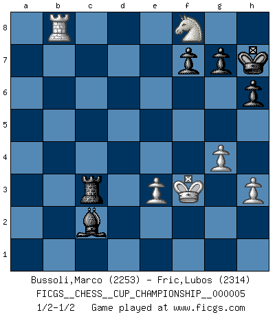 Last move : 1/2-1/2 2023 July 4 12:57:9 [Event "FICGS__CHESS__CUP_CHAMPIONSHIP__000005"] [Site "FICGS"] [Date "2023.03.23"] [Round "1"] [White "Bussoli,Marco"] [Black "Fric,Lubos"] [Result "1/2-1/2"] [WhiteElo "2253"] [BlackElo "2314"] 1.e4 e5 2.Nf3 Nc6 3.Bb5 a6 4.Ba4 Nf6 5.O-O Be7 6.Re1 b5 7.Bb3 O-O 8.a4 b4 9.d3 d6 10.c3 Rb8 11.Nbd2 Na5 12.Ba2 c5 13.d4 Qc7 14.dxe5 dxe5 15.Nc4 b3 16.Nxa5 Rd8 17.Qe2 Qxa5 18.Bb1 c4 19.Qxc4 Bc5 20.Qe2 Ng4 21.Be3 Bxe3 22.fxe3 Nf6 23.Bd3 Bg4 24.Red1 Qc5 25.a5 h6 26.Kh1 Ra8 27.Bxa6 Rxd1+ 28.Rxd1 Qxa5 29.Bc4 Qa2 30.h3 Nxe4 31.Kh2 Bh5 32.g4 Bg6 33.Nxe5 Nxc3 34.bxc3 Qxe2+ 35.Bxe2 Ra2 36.Kg2 Rxe2+ 37.Kf3 Rc2 38.Rd8+ Kh7 39.Rb8 b2 40.Nd7 b1Q 41.Rxb1 Rxc3 42.Rb8 Bc2 43.Nf8+ Kg8 44.Nd7 Kh7 45.Nf8+ 1/2-1/2 Follow this game move after move (download)Some part of a mistake is always correct. (Savielly Tartakover) Schach ist Kampf, hauptsächlich jedoch gegen die eigenen Fehler. (Savielly Grigorievitsch Tartakower) El Ajedrez es como la guerra en un tablero. (Bobby Fischer) 'L'échange des dames est un coup dur pour les deux adversaires...' Un journaliste lors d'une partie du match Spassky-Fischer SEO proverb : Make your website optimized for human beings, not for search engines.