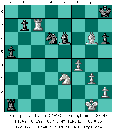 Last move : 1/2-1/2 2023 August 5 22:42:24 [Event "FICGS__CHESS__CUP_CHAMPIONSHIP__000005"] [Site "FICGS"] [Date "2023.03.23"] [Round "1"] [White "Hallqvist,Niklas"] [Black "Fric,Lubos"] [Result "1/2-1/2"] [WhiteElo "2249"] [BlackElo "2314"] 1.c4 e5 2.g3 Nf6 3.Bg2 d5 4.cxd5 Nxd5 5.Nc3 Nb6 6.a3 Be7 7.b4 O-O 8.Nf3 Nc6 9.O-O Be6 10.d3 a5 11.b5 Nd4 12.Bb2 Nb3 13.Rb1 f6 14.Nd2 Nxd2 15.Qxd2 Rb8 16.Qc1 h6 17.a4 Rf7 18.Ba3 Bd6 19.Ra1 f5 20.Qc2 Qe7 21.Qb2 Kh8 22.Rfc1 Rf6 23.Rc2 Qd7 24.Rac1 Rf7 25.Bxd6 cxd6 26.Qa3 Rc8 27.e3 f4 28.exf4 exf4 29.Ne4 Rxc2 30.Rxc2 f3 31.Bh1 Bh3 32.Nxd6 Rf4 33.Rc1 Rd4 34.Ne4 Qf5 35.Re1 Rxa4 36.Qe7 Nd7 37.Nd2 Nc5 38.Nxf3 Nxd3 39.Rd1 Kh7 40.Qe3 Nb2 41.Rc1 Qxb5 42.Nd4 Qg5 43.f4 Qf6 44.Be4+ g6 45.Rc7+ Kh8 46.Nc2 Nc4 47.Qc5 Qd6 48.Qxd6 Nxd6 49.Bxg6 Be6 50.Ne3 Ra1+ 1/2-1/2 Follow this game move after move (download)Chess is war over the board. The object is to crush the opponents mind. (Bobby Fischer) Wer mein Gambit spielt, muß bereit sein, alle Brücken hinter sich abzubrechen. Es verändert den ganzen Menschen. Es wirkt wie ein Zauberstab und fördert verkümmerte, gute Charakter- eigenschaften wieder zu Tage. (Emil Joseph Diemer) Cualquier cambio de material en una posición debe venir por medio de un mate, una captura o promoción de Peón. (Purdy) En blitz, le Cavalier l'emporte sur le Fou. (Vlastimil Hort) If things go wrong, don't go with them. (Roger Babson)