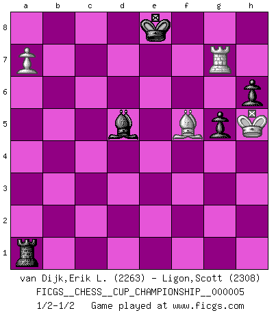 Last move : 1/2-1/2 2023 June 25 3:23:55 [Event "FICGS__CHESS__CUP_CHAMPIONSHIP__000005"] [Site "FICGS"] [Date "2023.03.23"] [Round "1"] [White "van Dijk,Erik L."] [Black "Ligon,Scott"] [Result "1/2-1/2"] [WhiteElo "2263"] [BlackElo "2308"] 1.e4 Nf6 2.e5 Nd5 3.d4 d6 4.c4 Nb6 5.f4 dxe5 6.fxe5 Nc6 7.Be3 Bf5 8.Nc3 e6 9.Nf3 Be7 10.Be2 f6 11.O-O O-O 12.exf6 Bxf6 13.Qd2 h6 14.Rad1 Qe8 15.Bf4 Qe7 16.h3 e5 17.Nxe5 Nxe5 18.dxe5 Bxe5 19.Nd5 Qc5+ 20.Be3 Qd6 21.b4 Nxd5 22.Bc5 Bf4 23.Bxd6 Bxd2 24.Rxd2 cxd6 25.Rxd5 Rae8 26.Rf2 Re6 27.c5 dxc5 28.Rxc5 Re7 29.Ra5 a6 30.Bxa6 Bxh3 31.Be2 Bd7 32.b5 Rxf2 33.Kxf2 Bf5 34.Ra7 Be4 35.a4 Re8 36.a5 Rf8+ 37.Kg3 Rf5 38.a6 bxa6 39.bxa6 Rg5+ 40.Kf4 Bxg2 41.Bc4+ Kf8 42.Rf7+ Ke8 43.a7 Rc5 44.Be6 g5+ 45.Kg3 Be4 46.Rg7 Ra5 47.Kg4 Ra1 48.Bf5 Bd5 49.Kh5 1/2-1/2 Follow this game move after move (download)The enormous mental resilience, without which no Chess player can exist, was so much taken up by Chess that he could never free his mind of this game. (Albert Einstein) Kostenjuk hat keinen Sexappeal. (Loek van Wely) Debió haber existido una vez en que los hombres eran semidióses, de otra manera no hubiesen podido inventar el Ajedrez. (Gustav Schenk) On peut tirer plus d'utilité d'une partie perdue que de 100 parties gagnées. (Capablanca) I don't diet. I just don't eat as much as I'd like to. (Linda Evangelista, supermodel)