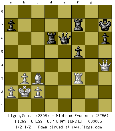 Last move : 1/2-1/2 2023 April 19 0:0:18 [Event "FICGS__CHESS__CUP_CHAMPIONSHIP__000005"] [Site "FICGS"] [Date "2023.03.23"] [Round "1"] [White "Ligon,Scott"] [Black "Michaud,Francois"] [Result "1/2-1/2"] [WhiteElo "2308"] [BlackElo "2256"] 1.e4 e5 2.f4 exf4 3.Bc4 Nc6 4.Nf3 g5 5.d4 Bg7 6.h4 h6 7.Nc3 d6 8.Qd3 Bg4 9.Bb5 Kf8 10.Bxc6 bxc6 11.Bd2 Ne7 12.O-O-O Ng6 13.Ne2 Bxf3 14.Qxf3 Nxh4 15.Rxh4 gxh4 16.Nxf4 Qf6 17.Kb1 Kg8 18.Bc3 Rh7 19.Rf1 Qg5 20.g4 Re8 21.e5 c5 22.exd6 cxd6 23.Nh5 Rf8 24.Nxg7 Rxg7 25.dxc5 Rg6 26.cxd6 Qxg4 27.Qd3 Qd7 28.Qd4 Kh7 29.b3 f5 30.Kb2 Rxd6 31.Qxh4 Rf7 32.Rf3 Qe6 1/2-1/2 Follow this game move after move (download)In blitz, the Knight is stronger than the Bishop. (Vlastimil Hort) Darum geht es im Schach. Einen Tag gibst du deinem Gegner eine Lektion, am nächsten Tag gibt er dir eine. (Robert James Fischer) Si el ingenio solamente fuese necesario para lucirse, las mujeres serían las mejores jugadoras de Ajedrez del mundo. (Albin) Vous m'avez demandé de vous exposer quel est le fondement de la prière. Je ne fais que préparer les pièces du jeu sur la table... Nous sera-t-il permis d'en adopter les règles et si nous les appliquons scrupuleusement nous ne tarderons pas à faire mat le Roi divin ! Il ne pourra échapper à nos mains. (Sainte Thérèse d'Avila, Chemin de perfection) Begin at the beginning and go on till you come to the end; then stop. (Lewis Carrol, Alice in Wonderland)