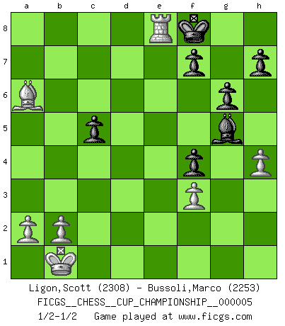Last move : 1/2-1/2 2023 May 4 19:30:11 [Event "FICGS__CHESS__CUP_CHAMPIONSHIP__000005"] [Site "FICGS"] [Date "2023.03.23"] [Round "1"] [White "Ligon,Scott"] [Black "Bussoli,Marco"] [Result "1/2-1/2"] [WhiteElo "2308"] [BlackElo "2253"] 1.e4 c5 2.Nc3 d6 3.Nge2 Nf6 4.d4 cxd4 5.Nxd4 a6 6.f3 e5 7.Nb3 Be7 8.Be3 O-O 9.Qd2 Be6 10.O-O-O Nbd7 11.g4 b5 12.g5 Nh5 13.Kb1 Nb6 14.Na5 Rc8 15.Nd5 Nxd5 16.exd5 Bxd5 17.Qxd5 Qxa5 18.c4 Nf4 19.Bxf4 exf4 20.h4 Qa4 21.Rc1 Rfe8 22.Bd3 Rc5 23.Qb7 bxc4 24.Qe4 g6 25.Rxc4 Qd7 26.Rxc5 dxc5 27.Re1 Kf8 28.Bxa6 Bxg5 29.Qxe8+ Qxe8 30.Rxe8+ 1/2-1/2 Follow this game move after move (download)Some sacrifices are sound; the rest are mine. (Mikhail Tal) Du musst nicht gut spielen, es reicht, wenn du besser spielst als dein Gegner. (Anonymous) Vive, pierde y aprende al observar a tu oponente como gana. (Amber Steenbock) RxDa4 pat (...) He who fights with monsters should be careful lest he thereby become a monster. (Friedrich Nietzsche, Beyond Good and Evil)