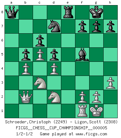 Last move : 1/2-1/2 2023 March 27 11:8:46 [Event "FICGS__CHESS__CUP_CHAMPIONSHIP__000005"] [Site "FICGS"] [Date "2023.03.23"] [Round "1"] [White "Schroeder,Christoph"] [Black "Ligon,Scott"] [Result "1/2-1/2"] [WhiteElo "2249"] [BlackElo "2308"] 1.e4 Nf6 2.e5 Nd5 3.d4 d6 4.c4 Nb6 5.exd6 exd6 6.Nc3 Be7 7.Be3 O-O 8.Nf3 Be6 9.b3 d5 10.c5 N6d7 11.b4 b6 12.Rc1 c6 13.a3 a5 14.h3 axb4 15.axb4 Na6 16.Bxa6 Rxa6 17.O-O b5 18.Ra1 Qa8 19.Bg5 Bxg5 20.Nxg5 Re8 21.Nf3 Rxa1 22.Qxa1 Bf5 23.Qb2 Be4 24.Nd2 Bf5 1/2-1/2 Follow this game move after move (download)Chess is the art of analysis. (Mikhail Botvinnik) Frage des Reporters: -Worin besteht das Ziel von Gambiteröffnungen? Antwort: -Auf Kosten der Partie einen Ruf als Angriffspieler zu erwerben.- (Siegbert Tarrasch) Prefiero perder una partida realmente buena, que ganar una mala. (David Levy) Karpov est une pièce de musée. (Garry Kasparov) They say poker is a zero-sum game. It must be, because every time I play my sum ends up zero. (Max Shapiro)