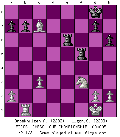 Last move : 1/2-1/2 2023 May 21 17:9:15 [Event "FICGS__CHESS__CUP_CHAMPIONSHIP__000005"] [Site "FICGS"] [Date "2023.03.23"] [Round "1"] [White "Broekhuizen,A. T. S."] [Black "Ligon,Scott"] [Result "1/2-1/2"] [WhiteElo "2233"] [BlackElo "2308"] 1.e4 Nf6 2.e5 Nd5 3.d4 d6 4.c4 Nb6 5.f4 dxe5 6.fxe5 Nc6 7.Be3 Bf5 8.Nc3 e6 9.Nf3 Be7 10.Be2 f6 11.O-O O-O 12.exf6 Bxf6 13.Qd2 h6 14.Rad1 Qe8 15.Bf4 Qe7 16.Bg3 Rad8 17.Qe3 Bg4 18.d5 exd5 19.Qxe7 Nxe7 20.Bxc7 Rde8 21.cxd5 Nexd5 22.Rxd5 Nxd5 23.Bc4 Bxc3 24.Bxd5+ Be6 25.Bxe6+ Rxe6 26.bxc3 Rf5 27.Rb1 1/2-1/2 Follow this game move after move (download)Bobby Fischer is the greatest Chess genius of all time ! (Alexander Kotov) Es ist besser die Steine des Gegners zu opfern. (Savielly Grigorievitsch Tartakower) La vida es como el Ajedrez, con lucha, competición y eventos buenos y malos. (Benjamin Franklin) Seul un grand joueur sait à quel point il joue faiblement. (Xavier Tartacover) It is not titles that honor men, but men that honor titles. (Niccolo Machiavelli)