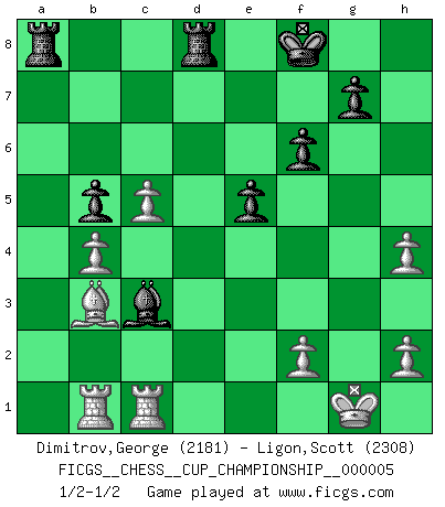 Last move : 1/2-1/2 2023 April 27 18:52:18 [Event "FICGS__CHESS__CUP_CHAMPIONSHIP__000005"] [Site "FICGS"] [Date "2023.03.23"] [Round "1"] [White "Dimitrov,George"] [Black "Ligon,Scott"] [Result "1/2-1/2"] [WhiteElo "2181"] [BlackElo "2308"] 1.e4 Nf6 2.e5 Nd5 3.d4 d6 4.Nf3 dxe5 5.Nxe5 c6 6.Be2 Bf5 7.O-O Nd7 8.Nf3 e6 9.c4 N5f6 10.Nc3 Bd6 11.Nh4 Bg6 12.g3 O-O 13.Nxg6 hxg6 14.Rb1 e5 15.d5 Qe7 16.a3 cxd5 17.Nxd5 Nxd5 18.Qxd5 Nf6 19.Qd2 Bc5 20.b4 Rfd8 21.Qc2 Bd4 22.c5 a5 23.Bc4 axb4 24.axb4 Qd7 25.Qxg6 b5 26.Bb3 Kf8 27.Qg5 Qh3 28.Qh4 Qxh4 29.gxh4 Nd5 30.Bg5 f6 31.Bd2 Nc3 32.Bxc3 Bxc3 33.Rfc1 1/2-1/2 Follow this game move after move (download)Chess is a sea in which a gnat may drink and an elephant may bathe. (Hindu proverb) Ich rechne überhaupt nicht voraus. Ich gewinne auch so. (Robert James Fischer) Las ideas audaces son como las piezas del Ajedrez que avanzan hacia adelante. Ellas pueden ser vencidas, pero también pueden iniciar una partida victoriosa. (Goethe) Psychologiquement, tu dois avoir confiance en toi même, mais cette confiance doit être basée sur des faits. (Robert Fischer) There is no instance of a country having benefited from prolonged warfare. (Sun Tzu)