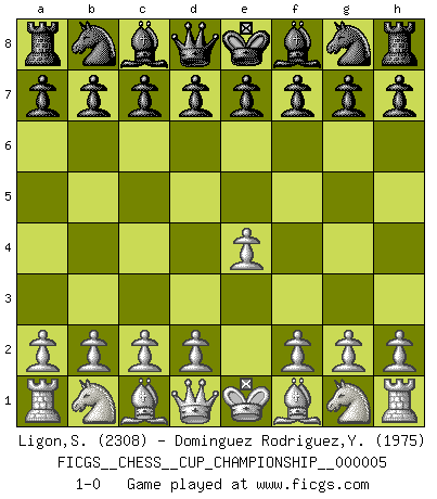 Last move : 1-0 2023 April 22 11:16:44 [Event "FICGS__CHESS__CUP_CHAMPIONSHIP__000005"] [Site "FICGS"] [Date "2023.03.23"] [Round "1"] [White "Ligon,Scott"] [Black "Dominguez Rodriguez,Yosvany"] [Result "1-0"] [WhiteElo "2308"] [BlackElo "1975"] 1.e4 1-0 This chess game has been lost on time (started : 2023.03.23 3:16:13) Follow this game move after move (download)I play correspondence chess because it is both art and science while chess is art only. (A player at FICGS) Ich verstehe mehr vom Schach als irgendein anderer lebender Meister. (José Raúl Capablanca) En manos de Fischer's, una diminuta ventaja teórica es tan buena como tener una Reina de ventaja. (Isaac Kashdan) Dans le domaine de la peinture, de la gravure et de la sculpture, dès la première décennie de notre siècle, les artistes abandonnent la représentation de la partie d'échecs pour se concentrer sur les pièces, sur les échiquiers et sur toutes les variations auxquelles les unes et les autres peuvent donner lieu. On passe en quelque sorte d'un thème social à un thème musical (au sens de la musica médiévale, c'est-à-dire d'une notion qui inclue le rythme, l'harmonie, la construction et la déconstruction, etc.). Graphiquement et picturalement, l'échiquier apparaît comme une structure ouverte, dynamique, d'une richesse infinie, autorisant toutes les combinatoires et débouchant sur des mouvements et des rythmes de nature exponentielle. (Michel Pastoureau) Mac users swear by their computers. PC users swear at their computers. (Author unknown)