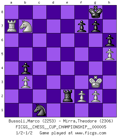 Last move : 1/2-1/2 2023 May 3 13:21:25 [Event "FICGS__CHESS__CUP_CHAMPIONSHIP__000005"] [Site "FICGS"] [Date "2023.03.23"] [Round "1"] [White "Bussoli,Marco"] [Black "Mirra,Theodore"] [Result "1/2-1/2"] [WhiteElo "2253"] [BlackElo "2306"] 1.d4 Nf6 2.c4 e6 3.Nf3 d5 4.Nc3 c6 5.e3 Nbd7 6.Bd3 dxc4 7.Bxc4 b5 8.Bd3 Bb7 9.e4 b4 10.Na4 c5 11.e5 Nd5 12.O-O cxd4 13.Nxd4 Nxe5 14.Bb5+ Nd7 15.Re1 Rc8 16.b3 Be7 17.Rxe6 O-O 18.Nc6 Rxc6 19.Rxc6 Bf6 20.Rxf6 Qxf6 21.Bb2 Ne5 22.Nc5 Nf3+ 23.Qxf3 Qxb2 24.Re1 Qc3 25.Qxc3 Nxc3 26.Nxb7 Nxb5 27.Re5 Nc3 28.Ra5 Re8 29.h4 Re1+ 30.Kh2 Re2 31.Rxa7 h6 32.Kg3 Nxa2 33.h5 Nc1 1/2-1/2 Follow this game move after move (download)Chess opens and enriches your mind. (Saudin Robovic) Ich hatte Angst gegen einen russischen Großmeister zu verlieren, und er befürchtete gegen einen kleinen Jungen zu verlieren. (über ein Remis gegen Juri Awerbach). (Robert James Fischer) Solo existe una cosa que Fischer hace en el Ajedrez sin placer: ¡perder!. (Boris Spassky) C'est une question de caractère, Beaucoup de gens perdent leur motivation très vite. D'autres, ils sont rares, peuvent la conserver très longtemps. J'aime les échecs, encore aujourd'hui je suis heureux d'analyser des parties. J'aime toujours gagner, je déteste encore perdre. Bien jouer est important pour mon intégrité intellectuelle et morale. Et puis les échecs vivent en ce moment une période historique grâce à Internet. Ils se développent dans les systèmes éducatifs à travers le monde. Ils sortent de leur ghetto, et c'est mon rôle de mener à bien cette révolution. (Gary Kasparov) The various flowers seem good to different people. (Chinese proverb)