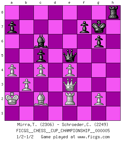 Last move : 1/2-1/2 2023 March 28 13:41:56 [Event "FICGS__CHESS__CUP_CHAMPIONSHIP__000005"] [Site "FICGS"] [Date "2023.03.23"] [Round "1"] [White "Mirra,Theodore"] [Black "Schroeder,Christoph"] [Result "1/2-1/2"] [WhiteElo "2306"] [BlackElo "2249"] 1.e4 e6 2.d4 d5 3.Nc3 dxe4 4.Nxe4 Nd7 5.Nf3 Ngf6 6.Nxf6+ Nxf6 7.Be3 Bd6 8.Bd3 O-O 9.Qe2 b6 10.O-O-O Bb7 11.Rhe1 c5 12.dxc5 bxc5 13.Bg5 h6 14.Bh4 Qc7 15.Ne5 Nd5 16.Bg3 Ne7 17.f3 Rad8 18.Kb1 Bd5 19.c4 Bb7 20.Bf2 Nc6 21.Nxc6 Bxc6 22.Bc2 Rd7 23.Qd3 g6 24.Qe3 Rfd8 25.Re2 Qb8 26.Bg3 Bxg3 27.Rxd7 Rxd7 28.hxg3 Rd4 29.Qxh6 Qxg3 30.b3 e5 31.Qc1 e4 32.fxe4 Qe5 33.Qe3 Kg7 34.a4 Rd8 35.Ka2 Rh8 1/2-1/2 Follow this game move after move (download)I am still a victim of Chess. It has all the beauty of art and much more. It cannot be commercialized. Chess is much purer than art in its social position. (Marcel Duchamp) Es ist peinlich, dass ich nie Weltmeister wurde. Es wäre leicht, Leonid Breschnjew als Ursache vorzuschieben, dessen Apparat den Vorzeigekommunisten Anatoli Karpow in allem unterstützte. Aber Garri Kasparow zum Beispiel, der ebenfalls von den Sowjets unerwünscht war, hat trotz der Widerstände den WM-Titel erobert. (Viktor Kortschnoi) El Ajedrez es de 30 a 40 por ciento psicología. Uno no cuenta con esto cuando se juega contra una computadora. No lo puedo confundir. (Judith Polgar) La victoire dans une partie d'Echecs appartient la plupart du temps à celui qui voit un peu plus loin que l'adversaire. (Lasker) The worth of a book is to be measured by what you can carry away from it. (James Bryce)