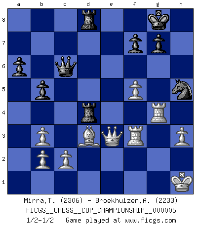 Last move : 1/2-1/2 2023 May 30 18:47:1 [Event "FICGS__CHESS__CUP_CHAMPIONSHIP__000005"] [Site "FICGS"] [Date "2023.03.23"] [Round "1"] [White "Mirra,Theodore"] [Black "Broekhuizen,A. T. S."] [Result "1/2-1/2"] [WhiteElo "2306"] [BlackElo "2233"] 1.e4 c5 2.Nf3 d6 3.d4 cxd4 4.Nxd4 Nf6 5.Nc3 a6 6.h3 e5 7.Nb3 Be6 8.Be3 Be7 9.f4 Nc6 10.f5 Bxb3 11.axb3 d5 12.exd5 Nb4 13.g3 O-O 14.Bg2 Qc7 15.O-O Rad8 16.Kh1 Rd7 17.Qd2 e4 18.Bf4 Qd8 19.Nxe4 Nxe4 20.Bxe4 Nxd5 21.Rad1 Nf6 22.Bd3 Bd6 23.Bxd6 Rxd6 24.Rde1 b5 25.Qf2 h5 26.Qa7 h4 27.Qf2 Nh5 28.gxh4 Rd4 29.Re3 Rxh4 30.Rf3 Rd4 31.Rg1 Qf6 32.Rg4 Rfd8 33.Qe3 Qc6 1/2-1/2 Follow this game move after move (download)Good offense and good defense both begin with good development. (Bruce A. Moon) Das ganze Leben mit einer Ehefrau ist wie ein Endspiel mit ungleichfarbigen Läufern. (Viktor Kortschnoi) Uno no tiene que jugar muy bien, es suficiente jugar mejor que el oponente. (Siegbert Tarrasch) On est toujours la mazette de quelqu'un d'autre. (Anonyme) You must have a dream in order to have it come true. (A.P.J. Kalam)