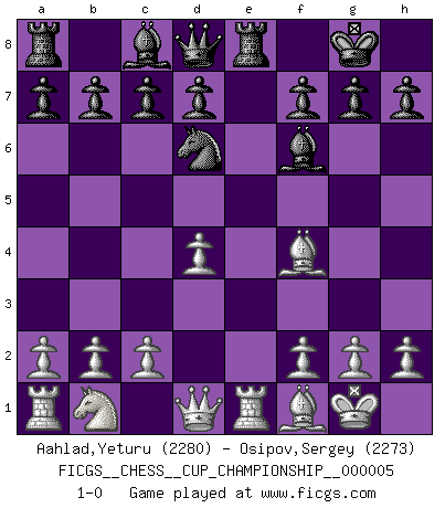 Last move : 1-0 2023 April 11 4:15:24 [Event "FICGS__CHESS__CUP_CHAMPIONSHIP__000005"] [Site "FICGS"] [Date "2023.03.23"] [Round "1"] [White "Aahlad,Yeturu"] [Black "Osipov,Sergey"] [Result "1-0"] [WhiteElo "2280"] [BlackElo "2273"] 1.e4 e5 2.Nf3 Nc6 3.Bb5 Nf6 4.O-O Nxe4 5.Re1 Nd6 6.Nxe5 Be7 7.Bf1 Nxe5 8.Rxe5 O-O 9.d4 Bf6 10.Re1 Re8 11.Bf4 1-0 Follow this game move after move (download)Many have become Chess Masters, no one has become the Master of Chess. (Siegbert Tarrasch) Mein Name ist Rustam Kamsky. Sie haben meinen Sohn belästigt. Bereiten Sie sich aufs Sterben vor. (Rustam Kamsky) A la fecha, Fischer esta simplemente un nivel arriba de todos los mejores jugadores de Ajedrez del mundo. (John Jacobs) Des points faibles ou des trous dans la position de l'adversaire doivent être occupés par des pièces et non pas par des pions. (Siegbert Tarrasch) Memory is a crazy woman that hoards colored rags and throws away food. (Austin O'Malley)