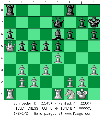 Last move : 1/2-1/2 2023 April 15 0:39:38 [Event "FICGS__CHESS__CUP_CHAMPIONSHIP__000005"] [Site "FICGS"] [Date "2023.03.23"] [Round "1"] [White "Schroeder,Christoph"] [Black "Aahlad,Yeturu"] [Result "1/2-1/2"] [WhiteElo "2249"] [BlackElo "2280"] 1.e4 e5 2.Nf3 Nc6 3.Bb5 a6 4.Ba4 Nf6 5.Nc3 Be7 6.O-O b5 7.Bb3 d6 8.Nd5 Na5 9.Nxe7 Qxe7 10.d3 O-O 11.Bg5 h6 12.Bh4 Nxb3 13.axb3 c5 14.Qd2 Qe6 15.Bxf6 Qxf6 16.Qa5 Qe7 17.Rfe1 Be6 18.h3 f6 19.Nd2 Kh7 20.Nf1 d5 1/2-1/2 Follow this game move after move (download)Up to this point White has been following well-known analysis. But now he makes a fatal error: he begins to use his own head. (Siegbert Tarrasch) Ich würde mich als ganz normalen Jungen bezeichnen [Im Alter von 12]. (Sergej Karjakin) El Ajedrez es una manera fabulosa para que los niños aprendan a autovalorarse y a autoestimarse. (Saudin Robovic) Les Cavaliers se révèlent fort utiles dans les positions fermées. D'habitude, les Fous sont un peu plus forts que les Cavaliers dans les positions ouvertes. Qu'on le veuille ou non, il restera toujours des exceptions ! Luck never made a man wise. (Seneca, Letters to Lucilius)