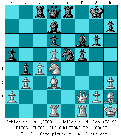 Last move : 1/2-1/2 2023 June 23 23:42:22 [Event "FICGS__CHESS__CUP_CHAMPIONSHIP__000005"] [Site "FICGS"] [Date "2023.03.23"] [Round "1"] [White "Aahlad,Yeturu"] [Black "Hallqvist,Niklas"] [Result "1/2-1/2"] [WhiteElo "2280"] [BlackElo "2249"] 1.e4 e6 2.Nc3 c5 3.Nf3 a6 4.d4 cxd4 5.Nxd4 b5 6.Bd3 Bb7 7.O-O b4 8.Na4 Nc6 9.Be3 Nf6 10.Nb3 Be7 11.f4 d6 12.Qe2 O-O 13.Rad1 Rb8 14.c4 e5 15.Nb6 exf4 16.Rxf4 Bc8 17.Nd5 Ne5 18.h3 Nxd5 19.exd5 Re8 20.R4f1 Bg5 21.Nd4 g6 22.Kh1 Bd7 23.Bg1 Rc8 24.Qc2 Bh4 25.Bh2 a5 26.b3 f5 27.Qd2 Bg5 28.Qf2 Bh4 29.Qb2 Bf6 30.Qf2 1/2-1/2 Follow this game move after move (download)Chess is not like life... it has rules ! (Mark Pasternak) Mutter, ich bin eben Ex-Weltmeister geworden. --beim nach Hause Kommen nach dem Verlust des WM-Titels an Mihail Botvinnik -- (Mikhail Nekhemyevich Tal) La vida es como un juego de Ajedrez, cambiando con cada movimiento. (Proverbio Chino) Psychologiquement, tu dois avoir confiance en toi même, mais cette confiance doit être basée sur des faits. (Robert Fischer) Only sick music makes money today. (Friedrich Nietzsche)