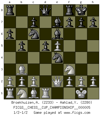 Last move : 1/2-1/2 2023 May 10 17:51:26 [Event "FICGS__CHESS__CUP_CHAMPIONSHIP__000005"] [Site "FICGS"] [Date "2023.03.23"] [Round "1"] [White "Broekhuizen,A. T. S."] [Black "Aahlad,Yeturu"] [Result "1/2-1/2"] [WhiteElo "2233"] [BlackElo "2280"] 1.e4 e5 2.Nf3 Nc6 3.Bb5 a6 4.Ba4 Nf6 5.O-O Nxe4 6.d4 b5 7.Bb3 d5 8.dxe5 Be6 9.Qe2 Be7 10.Rd1 O-O 1/2-1/2 Follow this game move after move (download)You are for me the Queen on d8 and I am the Pawn on d7 !! (Eduard Gufeld) Matt entspricht nicht immer den Tatsachen. (Savielly Grigorievitsch Tartakower) No nos podemos resistir a la fascinación de un sacrificio ya que la pasión por los sacrificios es parte de la naturaleza de un jugador de Ajedrez. (Rudolf Spielman) Même si l'adversaire joue le coup analysé précédemment, recommencez l'analyse en voyant la nouvelle position. Première règle de Blumenfeld When it is a question of money, everybody is of the same religion. (Voltaire)