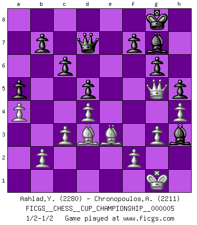 Last move : 1/2-1/2 2023 May 23 1:49:37 [Event "FICGS__CHESS__CUP_CHAMPIONSHIP__000005"] [Site "FICGS"] [Date "2023.03.23"] [Round "1"] [White "Aahlad,Yeturu"] [Black "Chronopoulos,Antonis"] [Result "1/2-1/2"] [WhiteElo "2280"] [BlackElo "2211"] 1.e4 e5 2.Nf3 Nc6 3.Bb5 Nf6 4.O-O Nxe4 5.Re1 Nd6 6.Nxe5 Nxe5 7.Bf1 Be7 8.Rxe5 O-O 9.d4 Bf6 10.Re1 Re8 11.Bf4 Rxe1 12.Qxe1 Ne8 13.c3 d5 14.Nd2 Bf5 15.Qe2 c6 16.Re1 Nd6 17.Qf3 Ne4 18.Nxe4 Bxe4 19.Qg4 Qb6 20.Bc1 g6 21.g3 h5 22.Qd1 Bf5 23.h4 Bg4 24.Be2 Be6 25.Bd3 Re8 26.a3 Re7 27.Qd2 Qd8 28.Qh6 Bh3 29.Rxe7 Qxe7 30.Be3 Bg7 31.Qf4 Qd8 32.a4 a5 33.Qg5 Bf6 34.Qf4 Bg7 35.Qg5 Qd7 1/2-1/2 Follow this game move after move (download)Chess is a matter of delicate judgment, knowing when to punch and how to duck. (Bobby Fischer) Dieses schreckliche Gefühl, dass ich gegen eine Maschine spielte, die niemals Fehler macht, zerschmetterte meinen Widerstand. (Mark Taimanov) Bobby Fischer es el jugador de Ajedrez mas grande que jamás haya existido. (Ken Smith) On croit qu'il y a plus de mauvais joueurs que de bons joueurs, c'est faux : Il y a autant de joueurs qui gagnent que de joueurs qui perdent. (Philippe Geluck) Whatever you do, don't be bored. This is absolutely the most exciting time we could have possibly hoped to be alive. And things are just starting. (From movie Waking life)
