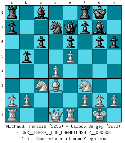 Last move : 1-0 2023 April 10 20:53:0 [Event "FICGS__CHESS__CUP_CHAMPIONSHIP__000005"] [Site "FICGS"] [Date "2023.03.23"] [Round "1"] [White "Michaud,Francois"] [Black "Osipov,Sergey"] [Result "1-0"] [WhiteElo "2256"] [BlackElo "2273"] 1.d4 Nf6 2.Nf3 e6 3.c4 d5 4.Nc3 c6 5.Bg5 h6 6.Bxf6 Qxf6 7.e3 Nd7 8.Be2 g6 9.O-O Qe7 10.e4 dxc4 11.e5 Bg7 12.Bxc4 O-O 13.Re1 b5 14.Bd3 1-0 Follow this game move after move (download)Though most people love to look at the games of the great attacking masters, some of the most successful players in history have been the quiet positional players. They slowly grind you down by taking away your space, tying up your pieces, and leaving you with virtually nothing to do ! (Yasser Seirawan) Kein Schachspieler kann gut schlafen. (H. G. Wells) Cada Peón es una Reina en potencia. (James Mason) Aux échecs, l'amour-propre est satisfait quand on remporte la victoire, mais il n'y a pas de honte à être battu. (Benjamin Franklin) The only thing that matters is the evidence. (Horatio Caine, C.S.I. Miami)