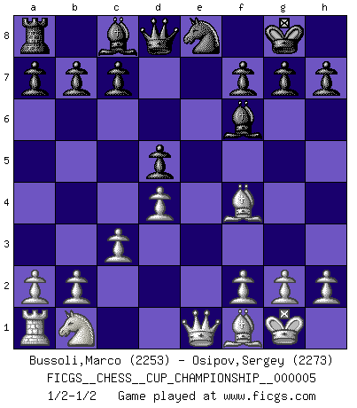 Last move : 1/2-1/2 2023 April 8 15:10:23 [Event "FICGS__CHESS__CUP_CHAMPIONSHIP__000005"] [Site "FICGS"] [Date "2023.03.23"] [Round "1"] [White "Bussoli,Marco"] [Black "Osipov,Sergey"] [Result "1/2-1/2"] [WhiteElo "2253"] [BlackElo "2273"] 1.e4 e5 2.Nf3 Nc6 3.Bb5 Nf6 4.O-O Nxe4 5.Re1 Nd6 6.Nxe5 Be7 7.Bf1 Nxe5 8.Rxe5 O-O 9.d4 Bf6 10.Re1 Re8 11.c3 Rxe1 12.Qxe1 Ne8 13.Bf4 d5 1/2-1/2 Follow this game move after move (download)By playing at Chess then, we may learn: First: Foresight... Second: Circumspection... Third: Caution... And lastly, we learn by Chess the habit of not being discouraged by present bad appearances in the state of our affairs, the habit of hoping for a favorable chance, and that of persevering in the secrets of resources. (Benjamin Franklin) Ein Großmeister muß tausende Partien in seinem Kopf speichern, denn diese sind für Ihn, was die Worte der Muttersprache für gewöhnliche Leute sind, oder Noten für Musiker... (Garry Kasparov) Debes de llevar a tu oponente hacia un profundo y obscuro bosque donde 2+2=5, y el camino que conduce a la salida es suficientemente ancho para solamente uno. (Mikhail Tal) Fischer est le meilleur joueur du monde et Karpov n'est qu'un joueur de bistrot. (Garry Kasparov, agé de 16 ans) Real knowledge is to know the extent of one's ignorance. (Confucius)
