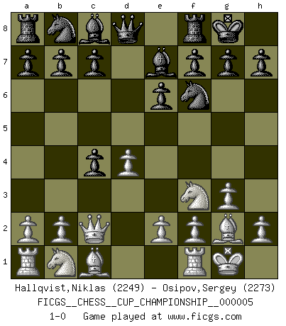 Last move : 1-0 2023 April 10 5:59:23 [Event "FICGS__CHESS__CUP_CHAMPIONSHIP__000005"] [Site "FICGS"] [Date "2023.03.23"] [Round "1"] [White "Hallqvist,Niklas"] [Black "Osipov,Sergey"] [Result "1-0"] [WhiteElo "2249"] [BlackElo "2273"] 1.d4 Nf6 2.c4 e6 3.g3 d5 4.Bg2 Be7 5.Nf3 O-O 6.O-O dxc4 7.Qc2 1-0 Follow this game move after move (download)Chess is imagination. (David Bronstein) Das Spiel gibt uns die Genugtuung, die das Leben uns versagt. (Emanuel Lasker) De todos mis libros Rusos, la defensa contiene y difunde el 'calor' mas grande que pudiese verse extraño al observar lo supremamente abstracto que el Ajedrez supuestamente es. (Vladimir Nabokov) Roi des jeux et jeu des rois, les échecs portent en eux un sentiment d'infini. Ils donnent à celui qui s'est efforcé d'en approfondir les arcanes l'impression de n'être pas à la mesure de l'homme; en fait, ils constituent un résumé de l'univers, un microcosme, et figurent cette grande échelle qui, dans les plans de la lumière descend jusqu'à la matière, qui des abîmes insondables remonte jusqu'en l'infini de Dieu. (Pyrame) There are two kinds of tragedy in this world, one is not getting what you want and the other is getting. (Lord of war)