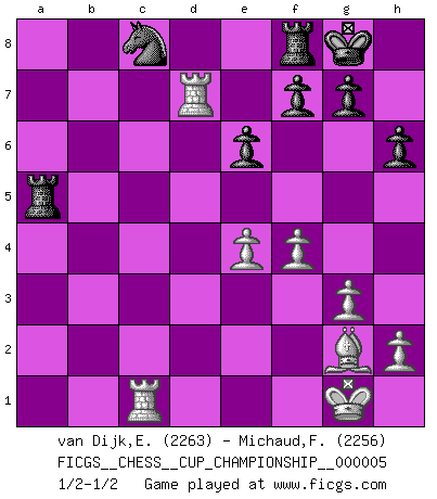 Last move : 1/2-1/2 2023 July 14 3:55:41 [Event "FICGS__CHESS__CUP_CHAMPIONSHIP__000005"] [Site "FICGS"] [Date "2023.03.23"] [Round "1"] [White "van Dijk,Erik L."] [Black "Michaud,Francois"] [Result "1/2-1/2"] [WhiteElo "2263"] [BlackElo "2256"] 1.d4 Nf6 2.c4 e6 3.g3 d5 4.Bg2 Bb4+ 5.Nd2 O-O 6.Ngf3 b6 7.O-O Bb7 8.Ne5 h6 9.a3 Be7 10.b4 a5 11.b5 c6 12.a4 cxb5 13.axb5 Nbd7 14.Nc6 Bxc6 15.bxc6 Nb8 16.e4 dxc4 17.Nxc4 Nxc6 18.Bb2 b5 19.Ne3 a4 20.d5 a3 21.Bxa3 Bxa3 22.dxc6 Qc7 23.Qe2 Bc5 24.Rac1 Bxe3 25.Qxe3 Ng4 26.Qc5 Ne5 27.Rfd1 b4 28.f4 Ra5 29.Qxb4 Qa7+ 30.Qd4 Nxc6 31.Qxa7 Nxa7 32.Rd7 Nc8 1/2-1/2 Follow this game move after move (download)That's what Chess is all about. One day you give your opponent a lesson, the next day he gives you one. (Bobby Fischer) Die Auseinandersetzung mit Karpow war politisch geprägt. Er stand für das kommunistische System, wurde von dessen Repräsentanten gehätschelt. Ich war der Oppositionelle. Jeder Schachweltmeister spiegelt auch die gesellschaftlichen Verhältnisse wider. Kramnik steht für die Börsen-Generation des Neuen Markts, ideologiefrei, zahlenfixiert. (Garry Kasparov) El jugador táctico debe saber que hacer cuando algo se debe de hacer. El estratégico debe saber que hacer cuando nada se debe de hacer. (Savielly Tartakover) Les Echecs sont affaire de jugement sensible. Savoir quand frapper et quand esquiver. (Fischer) Warrior pose battles inner weakness and wins focus. You see that there is no war within you. You're on your own side, and you are your own strength. (Terri Guillemets)