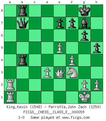 Last move : 1-0 2008 May 4 21:8:33 [Event "FICGS__CHESS__CLASS_E__000059"] [Site "FICGS"] [Date "2007.08.25"] [Round "1"] [White "King,Kevin"] [Black "Perrotta,John Zach"] [Result "1-0"] [WhiteElo "1548"] [BlackElo "1254"] 1.e4 c5 2.Nc3 Nc6 3.f4 g6 4.Nf3 Bg7 5.Bb5 Nd4 6.O-O Nxb5 7.Nxb5 Qb6 8.c4 a6 9.Nc3 Nf6 10.d3 O-O 11.e5 Ne8 12.Nd5 Qd8 13.Qe1 Nc7 14.Ne3 d5 15.Bd2 d4 16.Nd1 b5 17.b3 Bf5 18.Nf2 h5 19.Ne4 Rb8 20.Ba5 Bxe4 21.Qxe4 Qd7 22.cxb5 axb5 23.Bxc7 Rbc8 24.Ba5 Ra8 25.Bd2 b4 26.Qe1 Ra7 27.a3 bxa3 28.b4 cxb4 29.Bxb4 a2 30.Qf2 Qb7 31.Qxd4 Rb8 32.Rf2 Ra4 33.Rfxa2 Rxb4 34.Qe3 1-0 Sicilian : Grand Prix attack Kingside Castling by player White (move 6) Kingside Castling by player Black (move 10) Player White won this chess game. Follow this game move after move (download)Chess mastery essentially consists of analyzing Chess positions accurately. (Mikhail Botvinnik) Obwohl ich alt bin, darf mir niemand den Finger in den Mund stecken, sonst beisse ich. (Wilhelm Steinitz) El Ajedrez hace al hombre ser mas sabio y ver mas claro. (Vladimir Putin) Tous ces prétendus hommes politiques sont les pions, les Cavaliers, les Tours ou les Fous d'une partie d'échecs qui se jouera tant qu'un hasard ne renversera pas l'échiquier. (Honoré de Balzac) Before all elsed, be armed. (Niccolo Machiavelli)