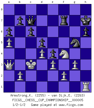 Last move : 1/2-1/2 2023 December 5 21:5:13 [Event "FICGS__CHESS__CUP_CHAMPIONSHIP__000005"] [Site "FICGS"] [Date "2023.03.23"] [Round "1"] [White "Armstrong,Keith"] [Black "van Dijk,Erik L."] [Result "1/2-1/2"] [WhiteElo "2255"] [BlackElo "2263"] 1.Nf3 f5 2.c4 Nf6 3.g3 g6 4.d4 Bg7 5.Bg2 O-O 6.O-O d6 7.Nc3 c6 8.Qb3 Na6 9.Bf4 Nh5 10.c5+ Kh8 11.cxd6 exd6 12.Bg5 Qe8 13.Rad1 d5 14.Qa3 Nf6 15.Bf4 Qd8 16.e3 Ne4 17.Rc1 Kg8 18.h4 h6 19.Be5 Rf7 20.Qb3 Nb8 21.h5 gxh5 22.Ne2 Nd7 23.Bxg7 Rxg7 24.Nf4 Ndf6 25.Rc2 Qb6 26.Qa3 Bd7 27.Nh4 Qd8 28.Bf3 Qe8 29.Qb3 Rb8 30.Qa3 a6 31.Qa5 Be6 32.Re1 Kh7 33.Qb6 Nd6 34.Kg2 Bf7 35.Rh1 Qd7 36.Qb4 Rbg8 37.Be2 Nde4 38.Bd3 Rg5 39.Rh3 Ng4 40.Nf3 R5g7 41.a3 Qc7 42.Kg1 Qd7 43.Kf1 Kh8 44.Nh4 Rg5 45.a4 Kh7 46.Re2 Ngf6 47.Nf3 Qc7 48.a5 Re8 49.Qa3 Kg8 50.Kg2 Rg7 51.Nh4 Rg5 52.Nf3 Rg7 53.Ne5 Ng5 54.Rh4 Nge4 55.Qb3 Kh8 56.Qb4 Kg8 57.Re1 Kh7 58.Nxf7 Qxf7 59.Reh1 Rg5 60.Bc2 Reg8 61.Qe1 Ng4 62.Rxh5 Rxh5 63.Rxh5 Re8 64.Qh1 Qf6 65.Bxe4 fxe4 66.Qd1 Rg8 67.Qc1 Qe7 68.Qd1 Qg7 69.Qe2 Qc7 70.Qd1 Qd7 71.Qh1 Qg7 72.Qh3 Qf6 73.Qh1 Qg7 74.Qh4 Qf7 75.Qh3 Rg7 76.Rh4 Qf5 77.Qh1 Qf6 78.Rh5 Qf7 79.Qe1 Rg5 80.Rh4 Qd7 81.Qb4 Kg7 82.Qc5 Kh7 83.Qf8 Rg8 84.Qb4 Nf6 85.Qc5 Rg7 86.Qa3 Qe7 87.Qa1 Qf7 88.Qd1 Rg5 89.Qb3 Qe7 90.Qd1 Qf7 91.Qc2 Nh5 92.Qc1 Ng7 93.Qc5 Nf5 94.Rh3 Qf6 95.Kf1 Qd6 96.Qb6 Qe7 97.Qb3 Ng7 98.Ke2 Ne6 99.Rh4 Rg7 100.Kd2 Ng5 101.Kc3 Qd6 102.Rh1 Qc7 103.Qa3 Rf7 104.Qc5 Qd7 105.Qa3 Qc7 1/2-1/2 Follow this game move after move (download)A chess genius has died; a loss for humanity. (Viktor Kortchnoi, about Bobby Fischer's death) Mein Gehirn das ist mein zweitwichtigstes Organ [Aus dem Film: Der Schläfer]. (Woody Allen) Una clavada es mas poderosa que una espada. (Fred Reinfeld) Karpov est une pièce de musée. (Garry Kasparov) The greatest con, that he ever pulled... was making you believe... that he is you. (Revolver, movie)