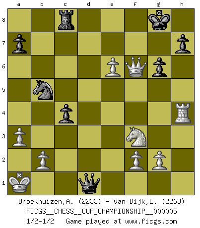 Last move : 1/2-1/2 2023 August 23 12:40:21 [Event "FICGS__CHESS__CUP_CHAMPIONSHIP__000005"] [Site "FICGS"] [Date "2023.03.23"] [Round "1"] [White "Broekhuizen,A. T. S."] [Black "van Dijk,Erik L."] [Result "1/2-1/2"] [WhiteElo "2233"] [BlackElo "2263"] 1.c4 Nf6 2.Nf3 g6 3.Nc3 d5 4.d4 Bg7 5.h4 dxc4 6.e4 c5 7.d5 b5 8.h5 Nxh5 9.Nxb5 Qa5+ 10.Nc3 Nd7 11.Qc2 Rb8 12.Bd2 Qa6 13.Na4 O-O 14.Bxc4 Qd6 15.O-O-O Ba6 16.Kb1 Bb5 17.Bxb5 Rxb5 18.Bc3 Rfb8 19.Bxg7 Nxg7 20.Rd2 Rb4 21.a3 Rb3 22.Rd3 Rxd3 23.Qxd3 c4 24.Qe3 Qa6 25.Qh6 Nf8 26.Qf4 Nd7 27.Nc3 Qb6 28.Qd2 Ne8 29.e5 Nc7 30.e6 fxe6 31.dxe6 Nf6 32.Rh4 Qc5 33.Ka1 Nb5 34.Qf4 Rc8 35.Ne4 Qd5 36.Nxf6+ exf6 37.Qxf6 Qd1+ 1/2-1/2 Follow this game move after move (download)Winning isn't everything... but losing is nothing. (Mednis) Obendrein hat der FIDE-Präsident den Revolutionsführer Gaddafi zum »Großmeister« ernannt, am Ende der WM. Das ist lächerlich! (Joel Lautier) Todo se encuentra en un estado de flujo y esto incluye al mundo del Ajedrez. (Mikhail Botvinnik) Il (Jacob Murray) ne joue pas pour le bon coup, mais pour le meilleur. (Eloi Relange) A bird doesn't sing because it has an answer, it sings because it has a song. (Maya Angelou)