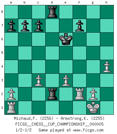 Last move : 1/2-1/2 2023 June 6 2:22:51 [Event "FICGS__CHESS__CUP_CHAMPIONSHIP__000005"] [Site "FICGS"] [Date "2023.03.23"] [Round "1"] [White "Michaud,Francois"] [Black "Armstrong,Keith"] [Result "1/2-1/2"] [WhiteElo "2256"] [BlackElo "2255"] 1.d4 Nf6 2.c4 e6 3.Nf3 d5 4.Nc3 Nbd7 5.Bf4 Bb4 6.cxd5 exd5 7.e3 Ne4 8.Qc2 g5 9.Be5 Rg8 10.Bd3 Bxc3+ 11.bxc3 g4 12.Bxe4 dxe4 13.Qxe4 Qe7 14.Qxh7 Rf8 15.Nd2 Nxe5 16.dxe5 Qxe5 17.Qe4 Qxe4 18.Nxe4 Ke7 19.O-O Be6 20.f4 gxf3 21.Rxf3 Rad8 22.Nc5 Rd2 23.Rf2 Rfd8 24.Nxe6 Kxe6 25.h4 1/2-1/2 Follow this game move after move (download)Chess is a terrible game. If you have no center, your opponent has a freer position. If you do have a center, then you really have something to worry about ! (Siegbert Tarrasch) Ohne Leiden bildet sich kein Charakter. (Ernst Freiherr von Feuchtersleben) Nunca antes ha habido un jugador de Ajedrez con tal conocimiento a fondo de las complejidades del juego y una inmensa voluntad absolutamente indomable de ganar. Yo pienso que Fischer es el jugador mas grande que jamás haya existido. (Lisa Lane) En blitz, le Cavalier l'emporte sur le Fou. (Vlastimil Hort) He who laughs last probably does not get the joke. (Unknown)