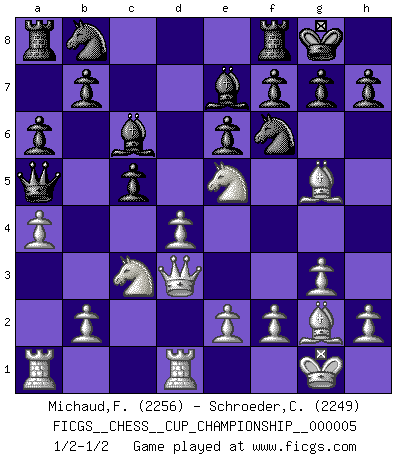 Last move : 1/2-1/2 2023 April 5 11:7:42 [Event "FICGS__CHESS__CUP_CHAMPIONSHIP__000005"] [Site "FICGS"] [Date "2023.03.23"] [Round "1"] [White "Michaud,Francois"] [Black "Schroeder,Christoph"] [Result "1/2-1/2"] [WhiteElo "2256"] [BlackElo "2249"] 1.d4 Nf6 2.c4 e6 3.g3 d5 4.Nf3 Be7 5.Bg2 O-O 6.O-O dxc4 7.Qc2 a6 8.a4 Bd7 9.Qxc4 Bc6 10.Bg5 Bd5 11.Qd3 c5 12.Nc3 Bc6 13.Rfd1 Qa5 14.Ne5 1/2-1/2 Follow this game move after move (download)I have added these principles to the law: get the Knights into action before both Bishops are developed. (Emanuel Lasker) Man braucht nicht immer den besten Zug zu spielen: Ein Zug muß aktiv, unternehmungslustig, korrekt und schön sein. (David Bronstein) El Ajedrez demanda una total concentración. (Bobby Fischer) Le succès, c'est être capable d'aller d'échec en échec sans perdre son enthousiasme. (Winston Churchill) When you have everything, sometimes it feels like nothing. (Horatio Caine, C.S.I. Miami)