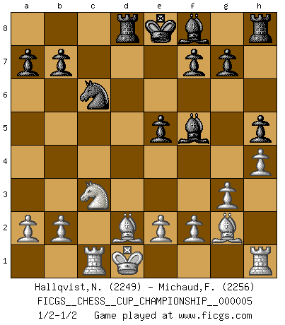 Last move : 1/2-1/2 2023 May 13 19:40:41 [Event "FICGS__CHESS__CUP_CHAMPIONSHIP__000005"] [Site "FICGS"] [Date "2023.03.23"] [Round "1"] [White "Hallqvist,Niklas"] [Black "Michaud,Francois"] [Result "1/2-1/2"] [WhiteElo "2249"] [BlackElo "2256"] 1.Nf3 Nf6 2.c4 c5 3.g3 d5 4.cxd5 Nxd5 5.Bg2 Nc6 6.d4 cxd4 7.Nxd4 Ndb4 8.Nxc6 Qxd1+ 9.Kxd1 Nxc6 10.Nc3 Bf5 11.Bd2 e5 12.Rc1 h5 13.h4 Rd8 1/2-1/2 Follow this game move after move (download)Look at Garry Kasparov. After he loses, invariably he wins the next game. He just kills the next guy. That's something that we have to learn to be able to do. (Maurice Ashley) Über Kasparov: Es ist offensichtlich, daß er in einem totalitären Staat aufwuchs und deshalb zu diktatorischen Zügen neigt. (Viktor Kortschnoi) Siempre es mucho mejor sacrificar las piezas de tu oponente. (Savielly Tartakover) C'est une question de caractère, Beaucoup de gens perdent leur motivation très vite. D'autres, ils sont rares, peuvent la conserver très longtemps. J'aime les échecs, encore aujourd'hui je suis heureux d'analyser des parties. J'aime toujours gagner, je déteste encore perdre. Bien jouer est important pour mon intégrité intellectuelle et morale. Et puis les échecs vivent en ce moment une période historique grâce à Internet. Ils se développent dans les systèmes éducatifs à travers le monde. Ils sortent de leur ghetto, et c'est mon rôle de mener à bien cette révolution. (Gary Kasparov) There's no money in correspondence chess. (John Knudsen)
