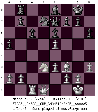 Last move : 1/2-1/2 2023 May 31 17:22:27 [Event "FICGS__CHESS__CUP_CHAMPIONSHIP__000005"] [Site "FICGS"] [Date "2023.03.23"] [Round "1"] [White "Michaud,Francois"] [Black "Dimitrov,George"] [Result "1/2-1/2"] [WhiteElo "2256"] [BlackElo "2181"] 1.d4 d5 2.c4 c6 3.Nf3 Nf6 4.Nc3 e6 5.Bg5 h6 6.Bxf6 Qxf6 7.e3 Nd7 8.Be2 Bd6 9.O-O dxc4 10.Nd2 Qe7 11.Nxc4 Bc7 12.Rc1 O-O 13.Qb3 Nf6 14.Ne5 Rb8 15.Na4 Rd8 16.h3 Bd7 17.Nc5 Be8 18.Rfd1 a5 19.Bf3 Bxe5 20.dxe5 Rxd1+ 21.Qxd1 Nd7 22.Nd3 1/2-1/2 Follow this game move after move (download)Let the perfectionist play postal. (Yasser Seirawan) Wenn Capablanka heute auf der Schachbühne erscheinen würde, hätte er ein halbes Jahr gebraucht um sich die Schachtheorie anzueignen. Und dann hätte er alles und jeden besiegt. (Mikhail Moiseyevich Botvinik) No puedes jugar al Ajedrez si eres de corazón noble. (Proverbio Francés) Roi des jeux et jeu des rois, les échecs portent en eux un sentiment d'infini. Ils donnent à celui qui s'est efforcé d'en approfondir les arcanes l'impression de n'être pas à la mesure de l'homme; en fait, ils constituent un résumé de l'univers, un microcosme, et figurent cette grande échelle qui, dans les plans de la lumière descend jusqu'à la matière, qui des abîmes insondables remonte jusqu'en l'infini de Dieu. (Pyrame) Is not life a hundred times too short to bore ourselves ? (Friedrich Nietzsche)
