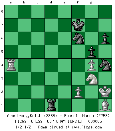 Last move : 1/2-1/2 2023 July 16 2:5:59 [Event "FICGS__CHESS__CUP_CHAMPIONSHIP__000005"] [Site "FICGS"] [Date "2023.03.23"] [Round "1"] [White "Armstrong,Keith"] [Black "Bussoli,Marco"] [Result "1/2-1/2"] [WhiteElo "2255"] [BlackElo "2253"] 1.Nf3 Nf6 2.c4 c5 3.Nc3 Nc6 4.d4 cxd4 5.Nxd4 e6 6.a3 Bc5 7.Nb3 Bb6 8.c5 Bc7 9.g3 b6 10.Bg2 Be5 11.O-O O-O 12.Qd3 Rb8 13.Rb1 bxc5 14.Nxc5 d5 15.b4 Bd6 16.Bf4 Bxf4 17.gxf4 Ne7 18.Rfd1 h6 19.Rbc1 Re8 20.h3 Ng6 21.e3 Nh4 22.Bh1 Qb6 23.N5a4 Qd8 24.Nc5 Qe7 25.Qd4 Nd7 26.Ne2 a5 27.Ng3 axb4 28.axb4 Rd8 29.Rb1 Bb7 30.Nxb7 Rxb7 31.e4 Nf6 32.exd5 Nxd5 33.f5 Rb5 34.Re1 Qg5 35.fxe6 fxe6 36.Qg4 Qxg4 37.hxg4 Rdb8 38.Rxe6 Nf6 39.Rd6 Rxb4 40.Rd8+ Rxd8 41.Rxb4 g5 42.Ra4 Rd1+ 43.Kh2 Rd2 44.Kg1 Rd1+ 45.Kh2 Kf7 1/2-1/2 Follow this game move after move (download)Every Chess master was once a beginner. (Chernev) Den Ruhm habe ich schon, jetzt brauche ich noch das Geld. (Wilhelm Steinitz) Bobby Fischer es el jugador de Ajedrez mas grande que jamás haya existido. (Ken Smith) On peut tirer plus d'utilité d'une partie perdue que de 100 parties gagnées. (Capablanca) If I had no sense of humor, I would long ago have committed suicide. (Mahatma Gandhi)