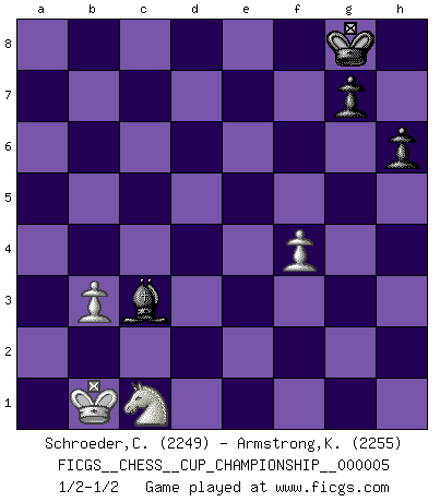 Last move : 1/2-1/2 2023 June 28 3:51:25 [Event "FICGS__CHESS__CUP_CHAMPIONSHIP__000005"] [Site "FICGS"] [Date "2023.03.23"] [Round "1"] [White "Schroeder,Christoph"] [Black "Armstrong,Keith"] [Result "1/2-1/2"] [WhiteElo "2249"] [BlackElo "2255"] 1.e4 c5 2.Nf3 d6 3.d4 cxd4 4.Nxd4 Nf6 5.Nc3 a6 6.Bg5 e6 7.f4 Nbd7 8.Qe2 Qc7 9.O-O-O b5 10.a3 Bb7 11.g4 Be7 12.Bh4 b4 13.axb4 a5 14.b5 a4 15.Bxf6 Bxf6 16.Qc4 Nc5 17.g5 Be7 18.h4 O-O 19.Kb1 Rfc8 20.Rh3 Bxe4 21.Nxe4 d5 22.Qe2 Nxe4 23.Bg2 a3 24.Bxe4 dxe4 25.Rc3 Qa5 26.Nb3 Qb6 27.Rxc8+ Rxc8 28.Rd7 Bf8 29.bxa3 Bxa3 30.h5 Bb4 31.Rd4 Bc3 32.Rc4 Qg1+ 33.Nc1 Rc5 34.Rxe4 h6 35.g6 fxg6 36.hxg6 Qxg6 37.Rxe6 Rxb5+ 38.Qxb5 Qxe6 39.Qb3 Qxb3+ 40.cxb3 1/2-1/2 Follow this game move after move (download)It is the aim of the modern school, not to treat every position according to one general law, but according to the principle inherent in the position. (Richard Reti) Ich war schon mal beim Dopingtest. Da musste ich Urin abgeben, während Dritte zusahen. (Elisabeth Pähtz) Un Peón pasado es un criminal, quién debe ser mantenido bajo candado y llave. Leves medidas, tales como vigilancia policiaca, no son suficientes. (Aaron Nimzovich) La solitude du joueur d'Echecs à l'approche du mat est semblable à celle du condamné. (Francis Szpiner) Watch your thoughts; they become words. Watch your words; they become actions. Watch your actions; they become habits. Watch your habits; they become character. Watch your character; it becomes your destiny. (Frank Outlaw)