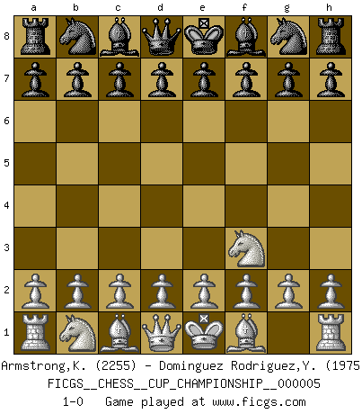 Last move : 1-0 2023 April 22 23:20:56 [Event "FICGS__CHESS__CUP_CHAMPIONSHIP__000005"] [Site "FICGS"] [Date "2023.03.23"] [Round "1"] [White "Armstrong,Keith"] [Black "Dominguez Rodriguez,Yosvany"] [Result "1-0"] [WhiteElo "2255"] [BlackElo "1975"] 1.Nf3 1-0 This chess game has been lost on time (started : 2023.03.23 3:16:13) Follow this game move after move (download)It is no time to be playing Chess when the house is on fire. (Italian Proverb) Charakterschwächen offenbaren sich normalerweise während einer Schachpartie. (Garry Kasparov) El Ajedrez es un cuento de Hadas de las 1001 metidas de pata. (Savielly Tartakower) Les Echecs représentent une sphère d'idées créatrices basée sur la volonté des deux protagonistes. (Smyslov) Gambling is the son of avarice and the father of despair. (French proverb)