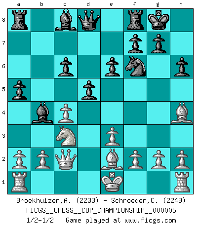 Last move : 1/2-1/2 2023 May 4 14:37:16 [Event "FICGS__CHESS__CUP_CHAMPIONSHIP__000005"] [Site "FICGS"] [Date "2023.03.23"] [Round "1"] [White "Broekhuizen,A. T. S."] [Black "Schroeder,Christoph"] [Result "1/2-1/2"] [WhiteElo "2233"] [BlackElo "2249"] 1.d4 Nf6 2.c4 e6 3.Nc3 Bb4 4.Qc2 O-O 5.Nf3 d5 6.Bg5 c5 7.e3 h6 8.Bh4 cxd4 9.Nxd4 Nc6 10.Nxc6 bxc6 11.Be2 a5 1/2-1/2 Follow this game move after move (download)You know you're going to lose. Even when I was ahead I knew I was going to lose. - On playing against Fischer. (Andrew Soltis) Privat ist Kortschnoi kein schlechter Mensch, sehr sympathisch. Aber während des Spiels ist er grausam. Er will dich töten. (Miguel Najdorf) Una victoria por una combinación errónea, aunque sea espectacular, me llena de horror artístico. (Wilhelm Steinitz) Comme les marins qui ont mille raisons différentes d'aller en mer, les joueurs d'échecs en ont tout autant avant de s'installer devant une table et jouer... (Vincent Bertignac, philosophe) You think that education is too expensive ? Try ignorance. (Derek Bok)