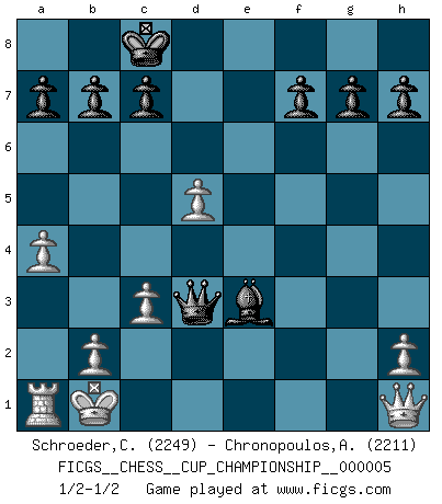Last move : 1/2-1/2 2023 March 30 22:21:48 [Event "FICGS__CHESS__CUP_CHAMPIONSHIP__000005"] [Site "FICGS"] [Date "2023.03.23"] [Round "1"] [White "Schroeder,Christoph"] [Black "Chronopoulos,Antonis"] [Result "1/2-1/2"] [WhiteElo "2249"] [BlackElo "2211"] 1.e4 e5 2.Nf3 Nc6 3.Bb5 Nf6 4.Nc3 Nd4 5.Bc4 Bc5 6.Nxe5 Qe7 7.Nf3 d5 8.Bxd5 Bg4 9.d3 O-O-O 10.Be3 Nxd5 11.Nxd5 Rxd5 12.exd5 Re8 13.c3 Nxf3+ 14.gxf3 Qh4 15.Kd2 Rxe3 16.fxe3 Qf2+ 17.Kc1 Bxf3 18.Qe1 Bxe3+ 19.Kb1 Bxh1 20.Qxh1 Qe2 21.a4 Qxd3+ 1/2-1/2 Follow this game move after move (download)The isolated Pawn casts gloom over the entire chessboard. (Aaron Nimzovich) Das Schachspiel ist ein See, in welchem eine Mücke baden und ein Elefant ertrinken kann. (Emanuel Lasker) Fischer era un maestro de claridad y un Rey del posicionamiento astuto. Sus oponentes podían ver hacia donde se dirigía pero eran impotentes para detenerlo. (Bruce Pandolfini) Horreur, mais aussi harmonie suprême : qu'y avait-il en effet au monde en dehors des échecs ? Le brouillard, l'inconnu, le non-être... (Vladimir Nabokov) There's no money in correspondence chess. (John Knudsen)