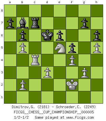 Last move : 1/2-1/2 2023 April 25 18:56:6 [Event "FICGS__CHESS__CUP_CHAMPIONSHIP__000005"] [Site "FICGS"] [Date "2023.03.23"] [Round "1"] [White "Dimitrov,George"] [Black "Schroeder,Christoph"] [Result "1/2-1/2"] [WhiteElo "2181"] [BlackElo "2249"] 1.e4 e6 2.d4 d5 3.Nc3 dxe4 4.Nxe4 Nd7 5.Nf3 Ngf6 6.Nxf6+ Nxf6 7.Bd3 c5 8.dxc5 Bxc5 9.Bf4 O-O 10.Qe2 Nd5 11.Bd2 Qc7 12.Qe4 f5 13.Qe2 Nb4 14.O-O Nxd3 15.cxd3 Qc6 16.Rac1 Qd5 17.a3 Rd8 18.Rfe1 h6 19.h4 b6 20.Bb4 Bxb4 21.axb4 Bb7 22.Qe5 Rac8 23.h5 Rxc1 24.Rxc1 Qxe5 25.Nxe5 Rc8 26.Rc4 Kf8 27.f4 Ke7 28.g3 Kd6 29.Kf2 Rc7 30.b5 1/2-1/2 Follow this game move after move (download)I am still a victim of Chess. It has all the beauty of art and much more. It cannot be commercialized. Chess is much purer than art in its social position. (Marcel Duchamp) Wenn man heute mit 14 Jahren noch kein GM ist, kann man es vergessen. (Viswanathan Anand) Con o sin el título, Bobby Fischer fue sin lugar a dudas el mas grande jugador de su época. (Burt Hochberg) Si je n'étais pas joueur d'échecs, je serais le meilleur dans quelque chose d'autre. (Anatoli Karpov) Internet: Absolute communication, absolute isolation. (Paul Carvel)
