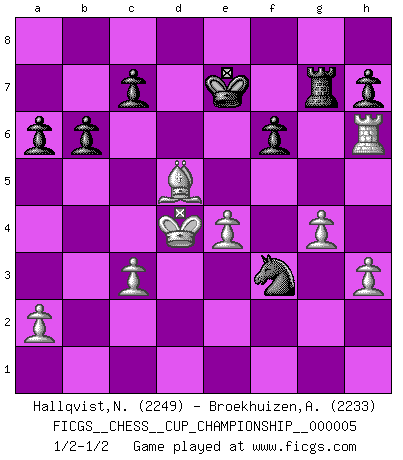 Last move : 1/2-1/2 2023 July 4 8:8:30 [Event "FICGS__CHESS__CUP_CHAMPIONSHIP__000005"] [Site "FICGS"] [Date "2023.03.23"] [Round "1"] [White "Hallqvist,Niklas"] [Black "Broekhuizen,A. T. S."] [Result "1/2-1/2"] [WhiteElo "2249"] [BlackElo "2233"] 1.d4 Nf6 2.c4 g6 3.Nc3 d5 4.cxd5 Nxd5 5.e4 Nxc3 6.bxc3 Bg7 7.Bf4 e5 8.Bxe5 Bxe5 9.dxe5 Qe7 10.f4 Nc6 11.Nf3 Bg4 12.h3 Rd8 13.Bd3 Bxf3 14.Qxf3 Qc5 15.Be2 g5 16.Rb1 gxf4 17.Rb5 Qe3 18.Qxe3 fxe3 19.Rf1 b6 20.Bc4 Rf8 21.Rf6 a6 22.Rd5 Rxd5 23.Bxd5 Nxe5 24.Ke2 Ke7 25.Rh6 Rg8 26.g4 Rg7 27.Kxe3 f6 28.Kd4 Nf3+ 1/2-1/2 Follow this game move after move (download)Those who say they understand Chess, understand nothing. (Robert Hubner) Besser ein falscher Plan, logisch durchgeführt, als gar kein Plan. (Viktor Kortschnoi) Dios mío, Bobby Fischer juega tan simple. (Alexei Suetin) On est toujours la mazette de quelqu'un d'autre. (Anonyme) Go and wake up your luck. (Persian saying)