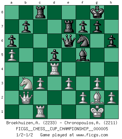 Last move : 1/2-1/2 2023 May 24 12:48:2 [Event "FICGS__CHESS__CUP_CHAMPIONSHIP__000005"] [Site "FICGS"] [Date "2023.03.23"] [Round "1"] [White "Broekhuizen,A. T. S."] [Black "Chronopoulos,Antonis"] [Result "1/2-1/2"] [WhiteElo "2233"] [BlackElo "2211"] 1.d4 Nf6 2.c4 e6 3.Nc3 Bb4 4.Qc2 O-O 5.Nf3 c5 6.dxc5 Na6 7.g3 Nxc5 8.Bg2 Nce4 9.O-O Bxc3 10.bxc3 Qc7 11.Nd4 d5 12.cxd5 exd5 13.Bf4 Qc5 14.Be5 Re8 15.Nb3 Qc6 16.Bd4 Bf5 17.Qb2 a6 18.a4 Rac8 19.e3 h6 20.a5 Qc7 21.Ra4 Re7 22.Rc1 Qd7 23.Bxf6 Nxf6 24.Rd4 Qe6 1/2-1/2 Follow this game move after move (download)You have to have the fighting spirit. You have to force moves and take chances. (Bobby Fischer) Die Idee von Capablanca, Schach als Fach in den Schulen zu lehren, ist großartig. (Fidel Castro) Debemos de asegurarnos de que el Ajedrez no se convierta en un lenguaje muerto, muy interesante, pero solo para un grupo muy pequeño. (Sytze Faber) D'abord les bases : Jouez et étudiez, puis étudiez et jouez, ensuite jouez et étudiez, puis étudiez et jouez. Deuxièmement : Donnez toujours le meilleur de vous-même ! (Ken Smith) Computer Science is no more about computers than astronomy is about telescopes. (Edsger W. Dijkstra)