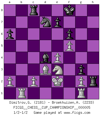 Last move : 1/2-1/2 2023 June 20 15:52:4 [Event "FICGS__CHESS__CUP_CHAMPIONSHIP__000005"] [Site "FICGS"] [Date "2023.03.23"] [Round "1"] [White "Dimitrov,George"] [Black "Broekhuizen,A. T. S."] [Result "1/2-1/2"] [WhiteElo "2181"] [BlackElo "2233"] 1.e4 c5 2.Nf3 d6 3.d4 cxd4 4.Nxd4 Nf6 5.Nc3 a6 6.Be3 Ng4 7.Bg5 h6 8.Bh4 g5 9.Bg3 Bg7 10.h3 Ne5 11.Nf5 Bxf5 12.exf5 Nbd7 13.Be2 Nf6 14.Bxe5 dxe5 15.Qxd8+ Rxd8 16.f3 e4 17.fxe4 h5 18.Rf1 Nd7 19.Nd5 Bxb2 20.Rb1 Be5 21.Rxb7 Kf8 22.Bd3 Nc5 23.Rb6 g4 24.hxg4 hxg4 25.Ke2 Rh2 26.Kf2 Rc8 27.Ne3 g3+ 28.Ke2 Bd4 29.R6b1 f6 30.Rg1 Nd7 1/2-1/2 Follow this game move after move (download)Chess is a more highly symbolic game, but the aggressions are therefore even more frankly represented in the play. It probably began as a war game; that is, the representation of a miniature battle between the forces of two kingdoms. (Karl Meninger) Ivan Sokolov treibt mich als Beifahrer an mit go Loeky go - . (Loek van Wely) Personalmente, yo prefiero mirar hacia el futuro en donde un programa de computadora gane el título mundial de Ajedrez. La humanidad necesita una lección de humildad. (Richard Dawkings) Un journaliste : 'Vous préférez avoir une dame de plus sur l'échiquier ou au lit ?' Boris Spassky : 'Ca dépend de la position.' The production of too many useful things results in too many useless people. (Karl Marx)