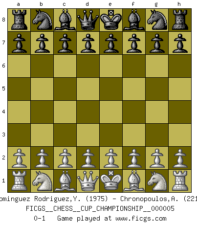 Last move : 0-1 2023 April 22 11:16:44 [Event "FICGS__CHESS__CUP_CHAMPIONSHIP__000005"] [Site "FICGS"] [Date "2023.03.23"] [Round "1"] [White "Dominguez Rodriguez,Yosvany"] [Black "Chronopoulos,Antonis"] [Result "0-1"] [WhiteElo "1975"] [BlackElo "2211"] 0-1 This chess game has been lost on time (started : 2023.03.23 3:16:13) Follow this game move after move (download)In Chess, at least, the brave inherit the earth. (Edmar Mednis) Man gibt nur Pakete auf. (Paul Keres) Aquellos que dicen que entienden al Ajedrez, no entienden nada. (Robert Hubner) Ce qui caractérise les parties de combat, c'est que si le défenseur a constamment de difficiles problèmes à résoudre, l'attaquant doit chercher sans relâche de nouvelles possibilités d'attaque. (Koblentz) Industry executives and analysts often mistakenly talk about strategy as if it were some kind of chess match. But in chess, you have just two opponents, each with identical resources, and with luck playing a minimal role. The real world is much more like a poker game, with multiple players trying to make the best of whatever hand fortune has dealt them. In our industry, Bill Gates owns the table until someone proves otherwise. (David Moschella, 'Computerworld')