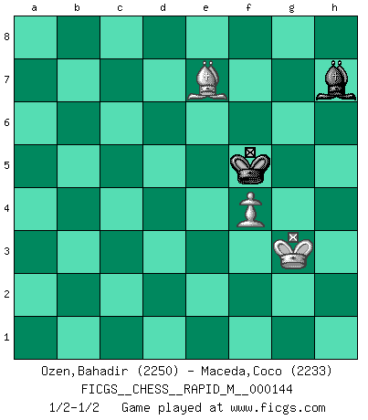 Last move : 1/2-1/2 2023 May 30 5:57:2 [Event "FICGS__CHESS__RAPID_M__000144"] [Site "FICGS"] [Date "2023.03.24"] [Round "1"] [White "Ozen,Bahadir"] [Black "Maceda,Coco"] [Result "1/2-1/2"] [WhiteElo "2250"] [BlackElo "2233"] 1.e4 e5 2.Nf3 Nc6 3.Bb5 a6 4.Ba4 Nf6 5.O-O Be7 6.Re1 b5 7.Bb3 O-O 8.h3 Bb7 9.d3 d5 10.exd5 Nxd5 11.Nxe5 Nd4 12.Nc3 Nxb3 13.axb3 Nb4 14.Ne4 Qd5 15.Bf4 c5 16.Re3 f5 17.c4 Qd8 18.Nc3 Bf6 19.Qd2 Re8 20.Rae1 Re7 21.R3e2 h6 22.Bg3 g5 23.f3 Qd4+ 24.Bf2 Qd6 25.d4 cxd4 26.Qxd4 Qxd4 27.Bxd4 Rae8 28.Kf1 Bxe5 29.Bxe5 Nd3 30.Bf6 Rxe2 31.Rxe2 Bc6 32.h4 gxh4 33.cxb5 axb5 34.Bxh4 b4 35.Rxe8+ Bxe8 36.Ne2 Nxb2 37.Nd4 Nd3 38.Nxf5 Kh7 39.Nd4 Bf7 40.Be7 h5 41.Kg1 Bd5 42.Bd6 Kg6 43.Kf1 Nc1 44.Bxb4 Nxb3 45.Nxb3 Bxb3 46.Kf2 h4 47.Be7 h3 48.gxh3 Kf5 49.Kg3 Bd1 50.h4 Bb3 51.h5 Bf7 52.h6 Bg8 53.h7 Bxh7 54.f4 1/2-1/2 Follow this game move after move (download)Chess is a matter of delicate judgment, knowing when to punch and how to duck. (Bobby Fischer) Mein erstes Ziel war nicht, die Partie zu gewinnen, sondern eine Figur zu opfern. -- der junge (Wilhelm Steinitz) Solo los afeminados hacen el Enroque. (Rob Sillars) Le jeu d'échecs fait naître et fortifie en nous plusieurs qualités précieuses dans le cours de l'existence, telles que la prévoyance, la circonspection, la prudence, et la persévérance. (Benjamin Franklin - 1783, la morale des échecs) Nothing is more important for teaching us to understand the concepts we have than constructing fictitious ones. (Ludwig Wittgenstein)